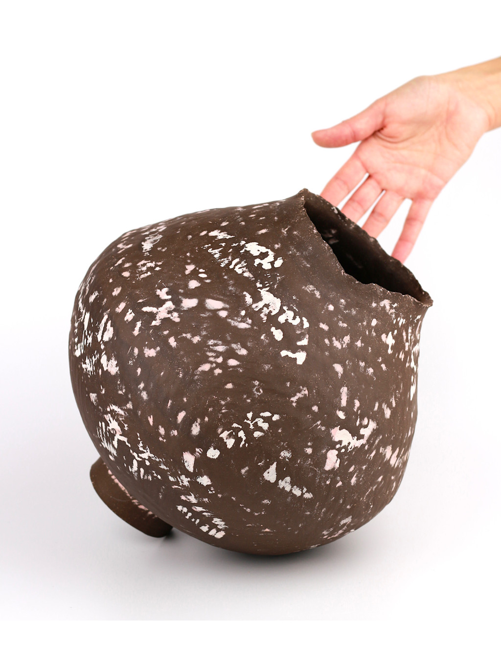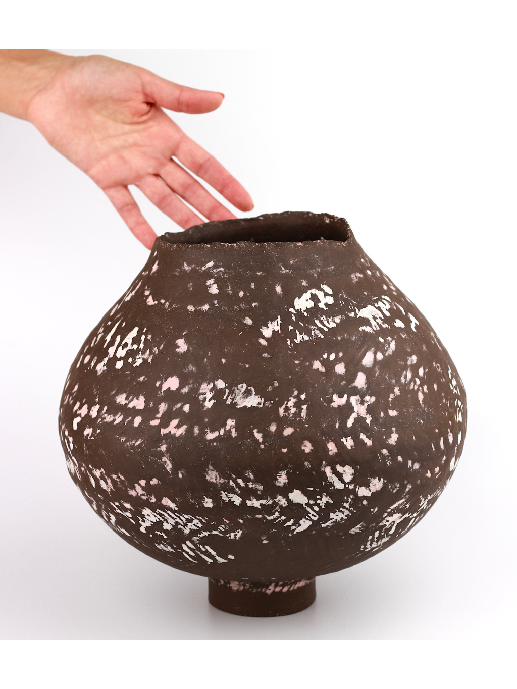 Modelovaná z tmavé hlíny technikou handbuilt a dvakrát vypálená při vysokých teplotách, váza získává výjimečnou pevnost a estetickou hloubku. Uvnitř ji pokrývá glazura, která nejen chrání, ale zároveň dodává jemný kontrast k přírodnímu povrchu zvenčí. Bez obav ji naplníte vodou i čerstvými květinami.