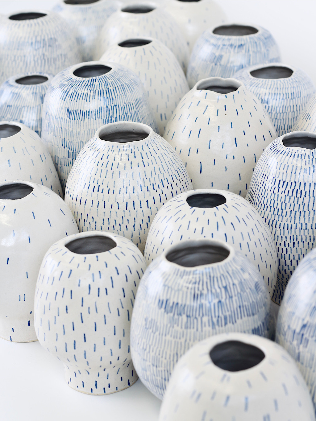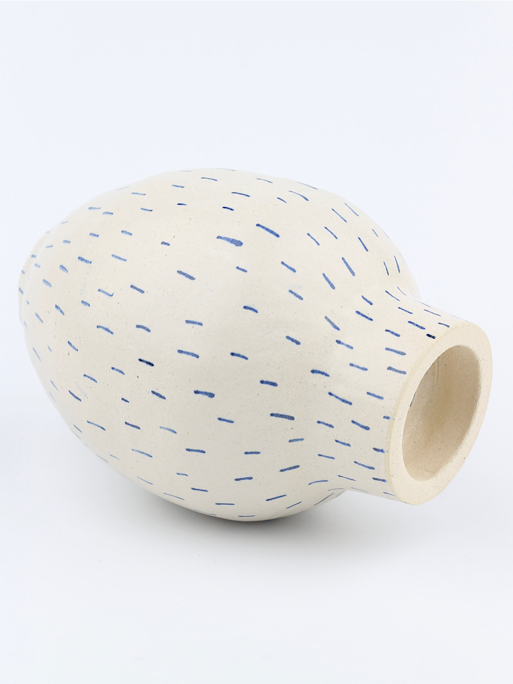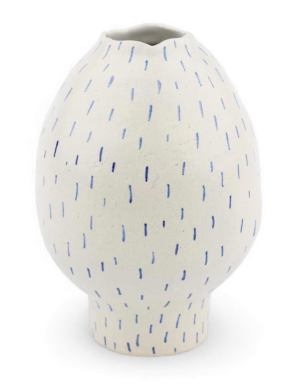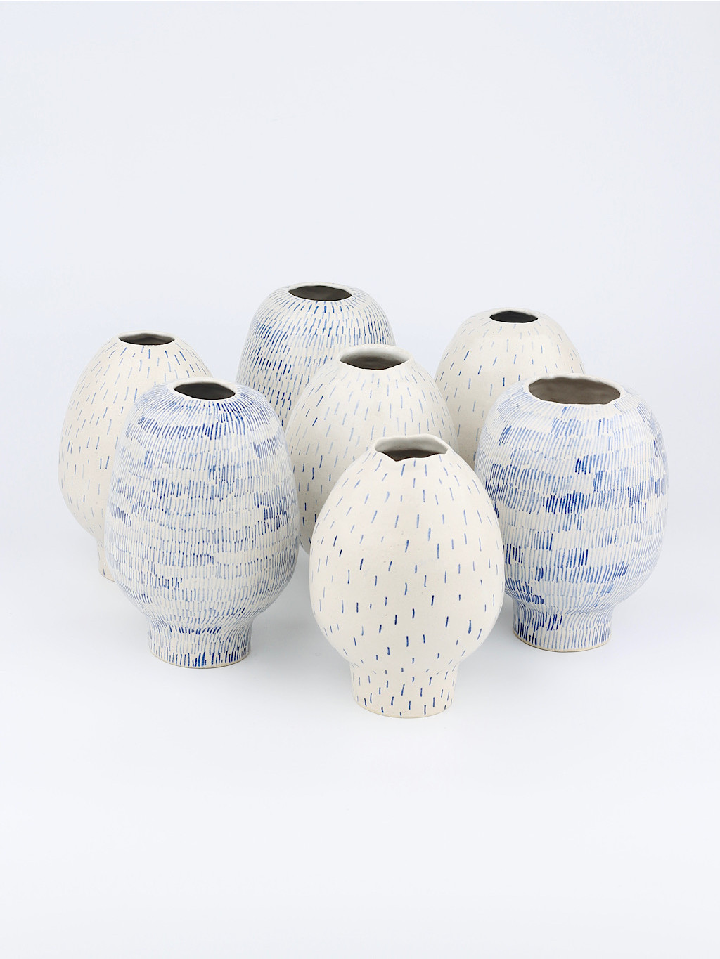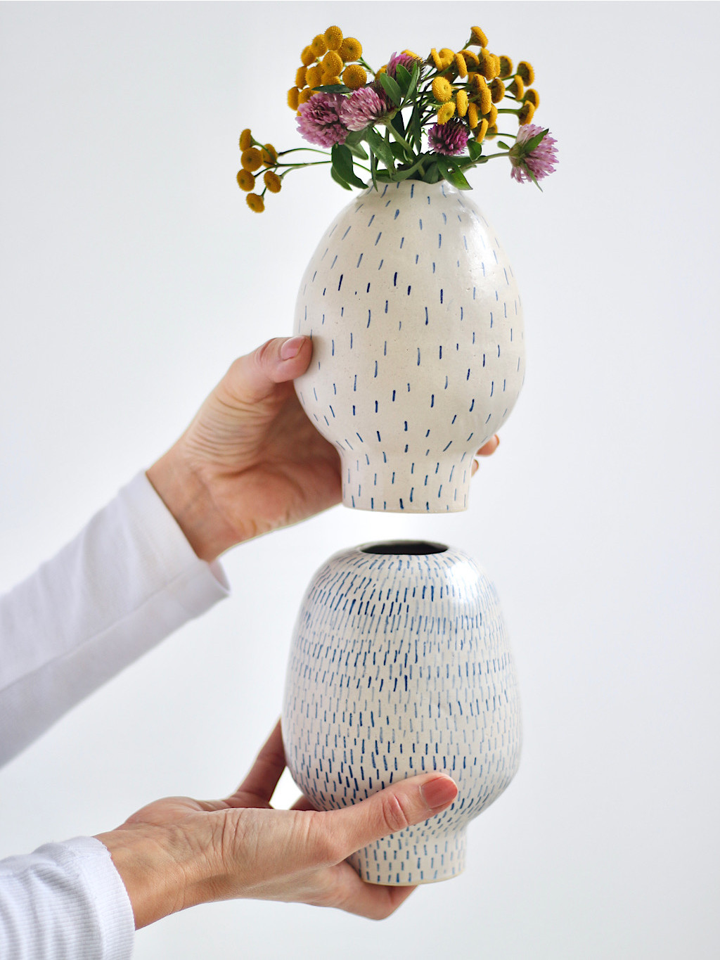 Vázy INK se hodí do komorních prostor i jako ozdoba pracovního stolu. Bílá glazura a modré linky evokují inkoustem psaný záznam nálady nebo tichého sdělení.