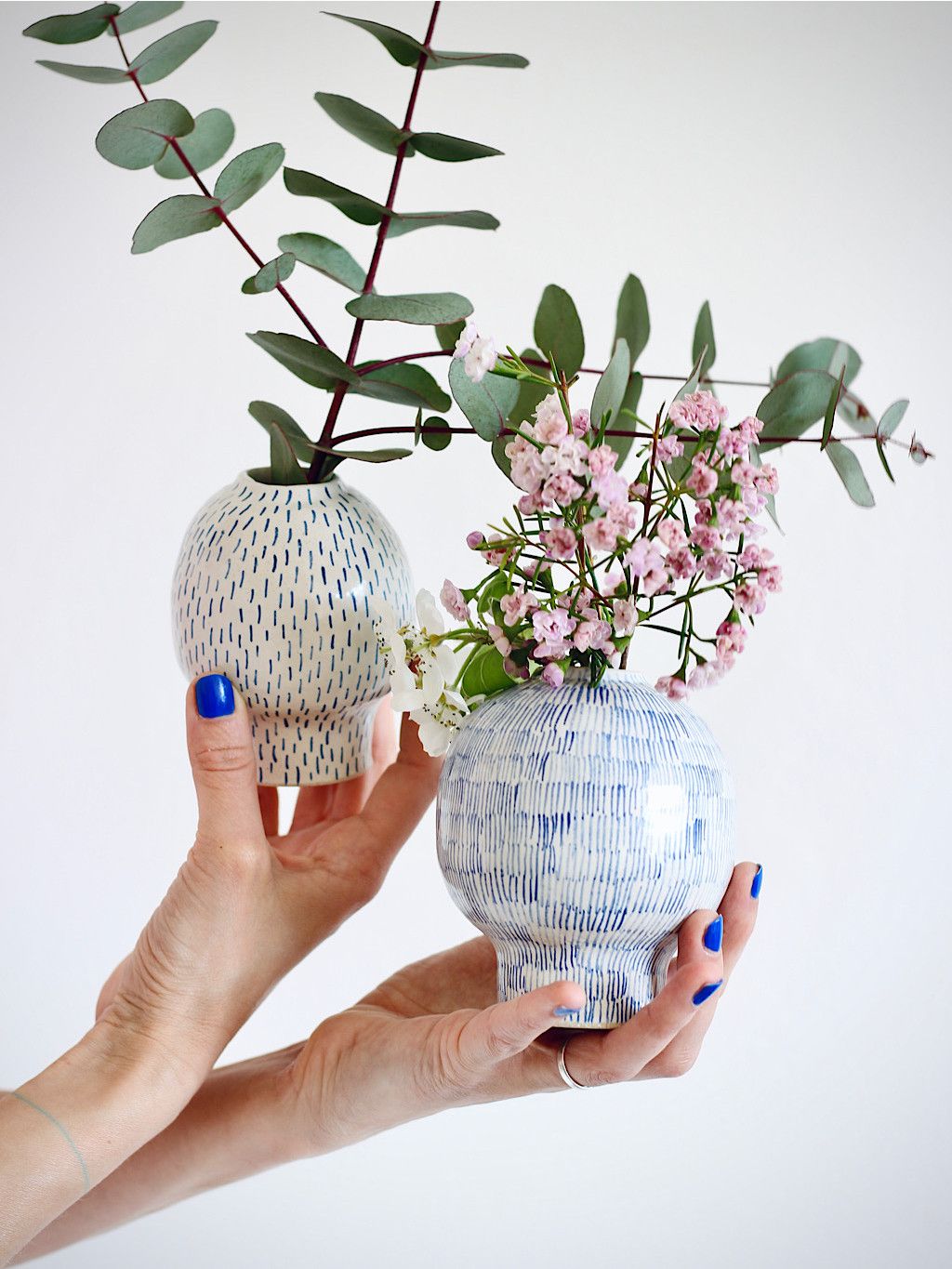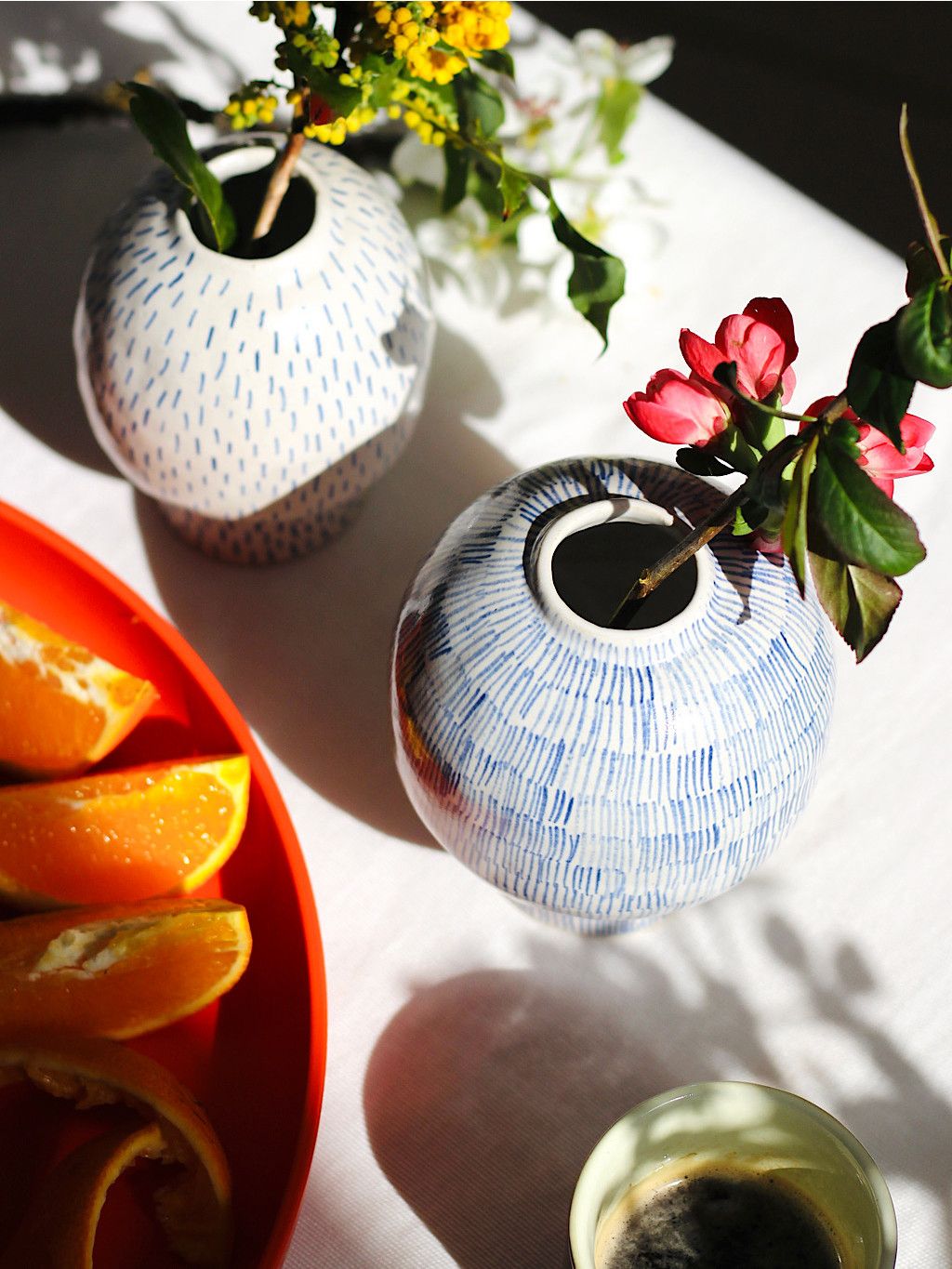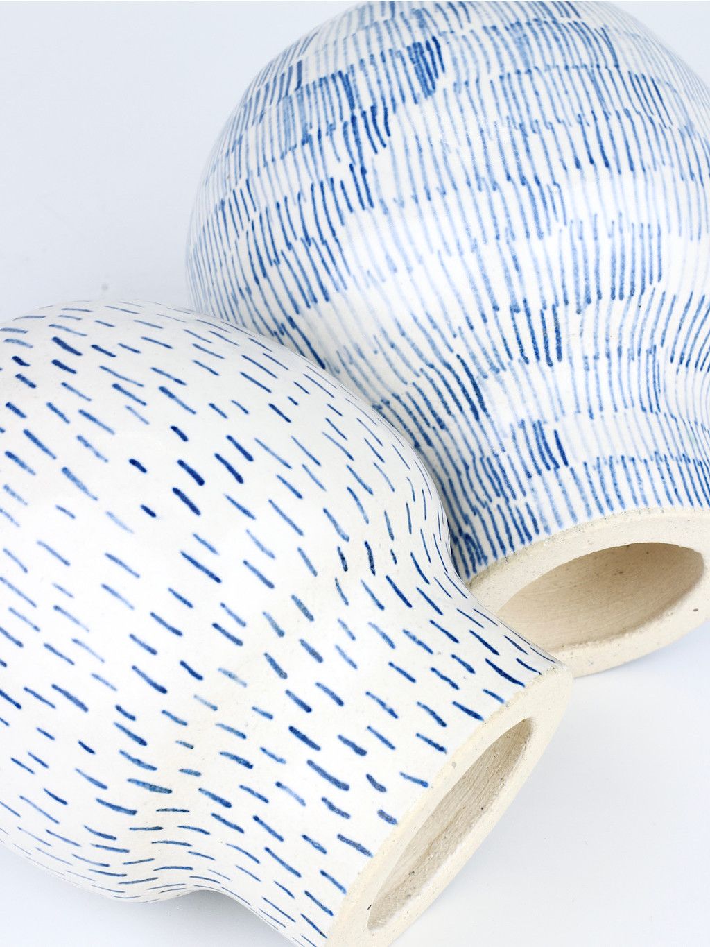 Vázy INK se hodí do komorních prostor i jako ozdoba pracovního stolu. Bílá glazura a modré linky evokují inkoustem psaný záznam nálady nebo tichého sdělení.