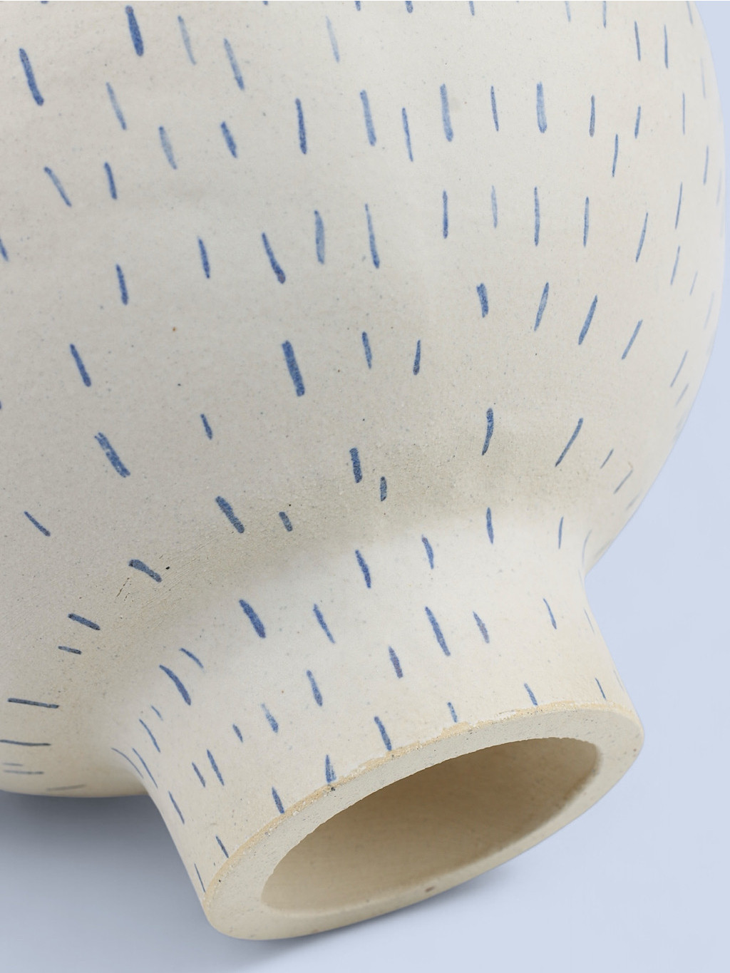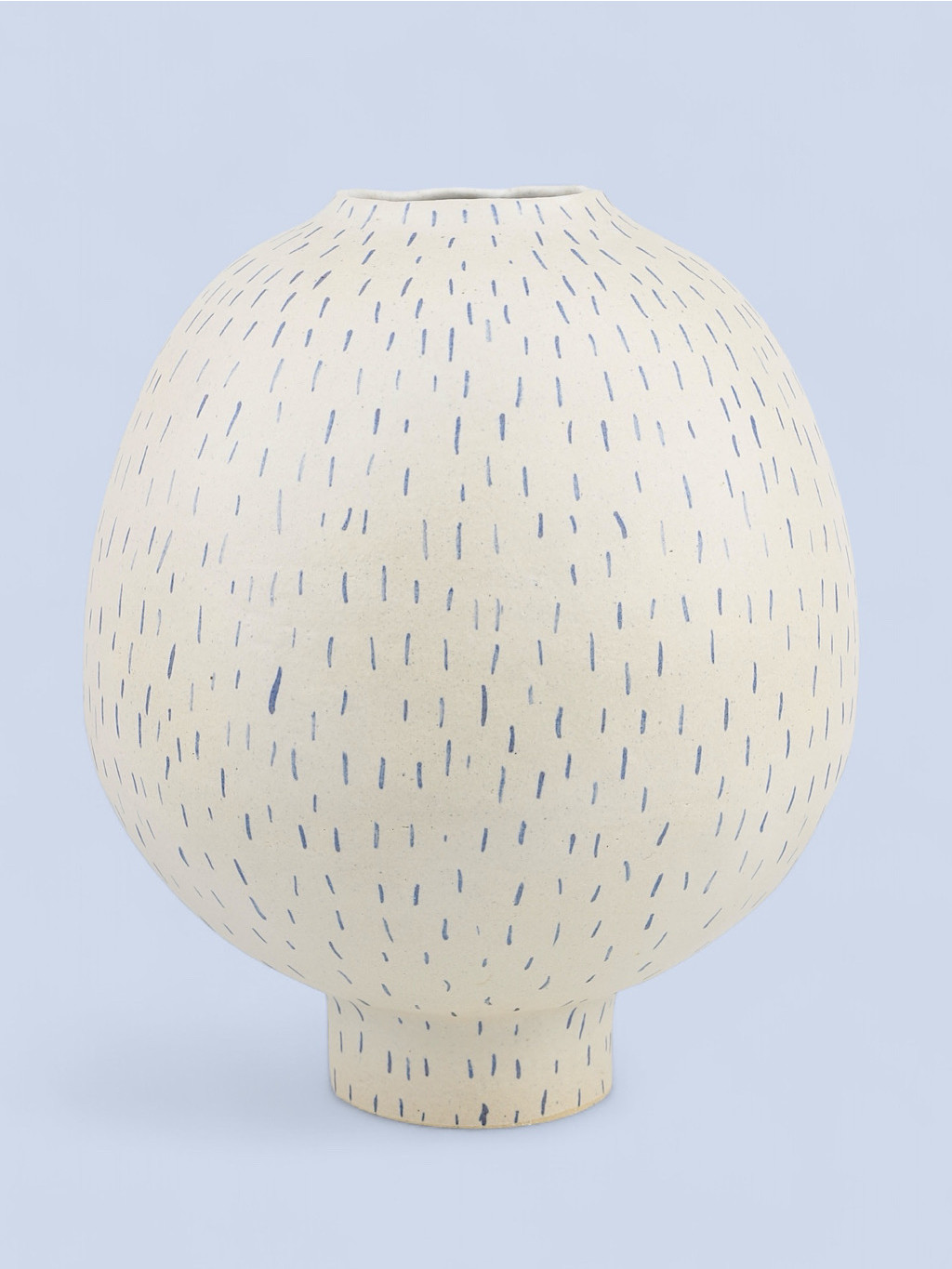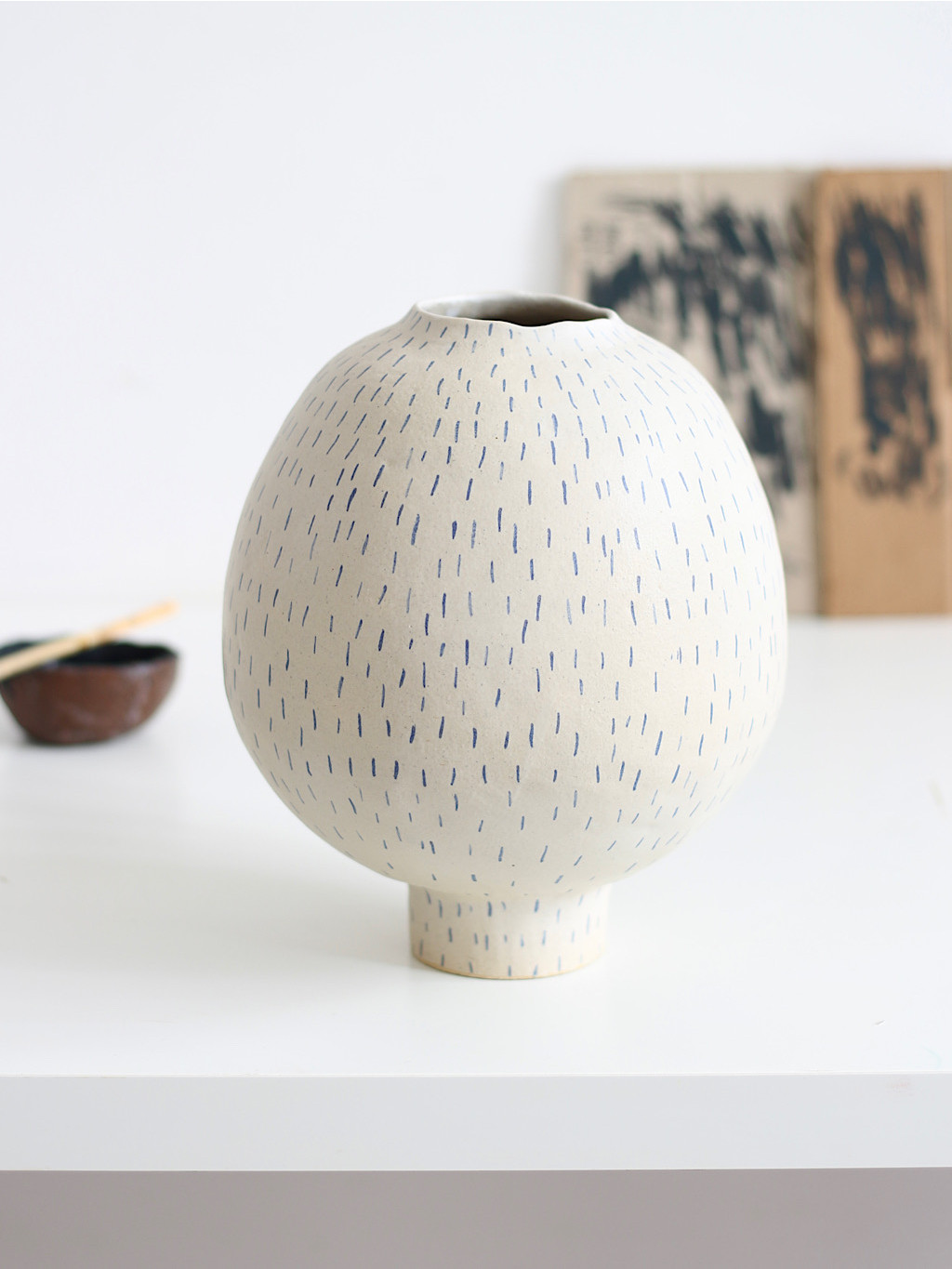 Vázy INK se hodí do komorních prostor i jako ozdoba pracovního stolu. Bílá glazura a modré linky evokují inkoustem psaný záznam nálady nebo tichého sdělení.