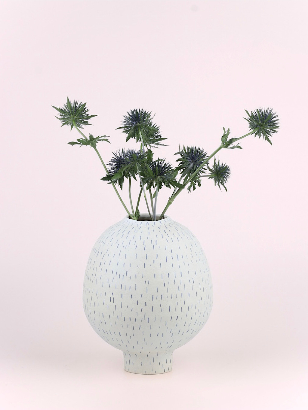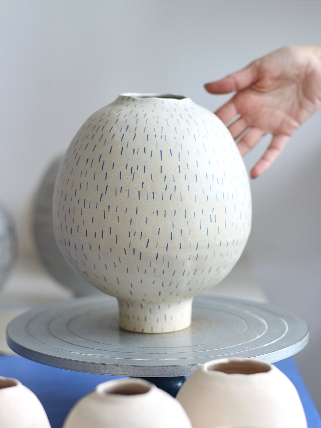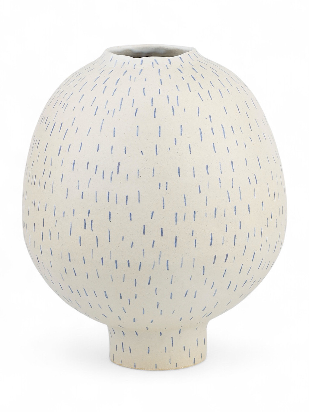 Vázy INK se hodí do komorních prostor i jako ozdoba pracovního stolu. Bílá glazura a modré linky evokují inkoustem psaný záznam nálady nebo tichého sdělení.