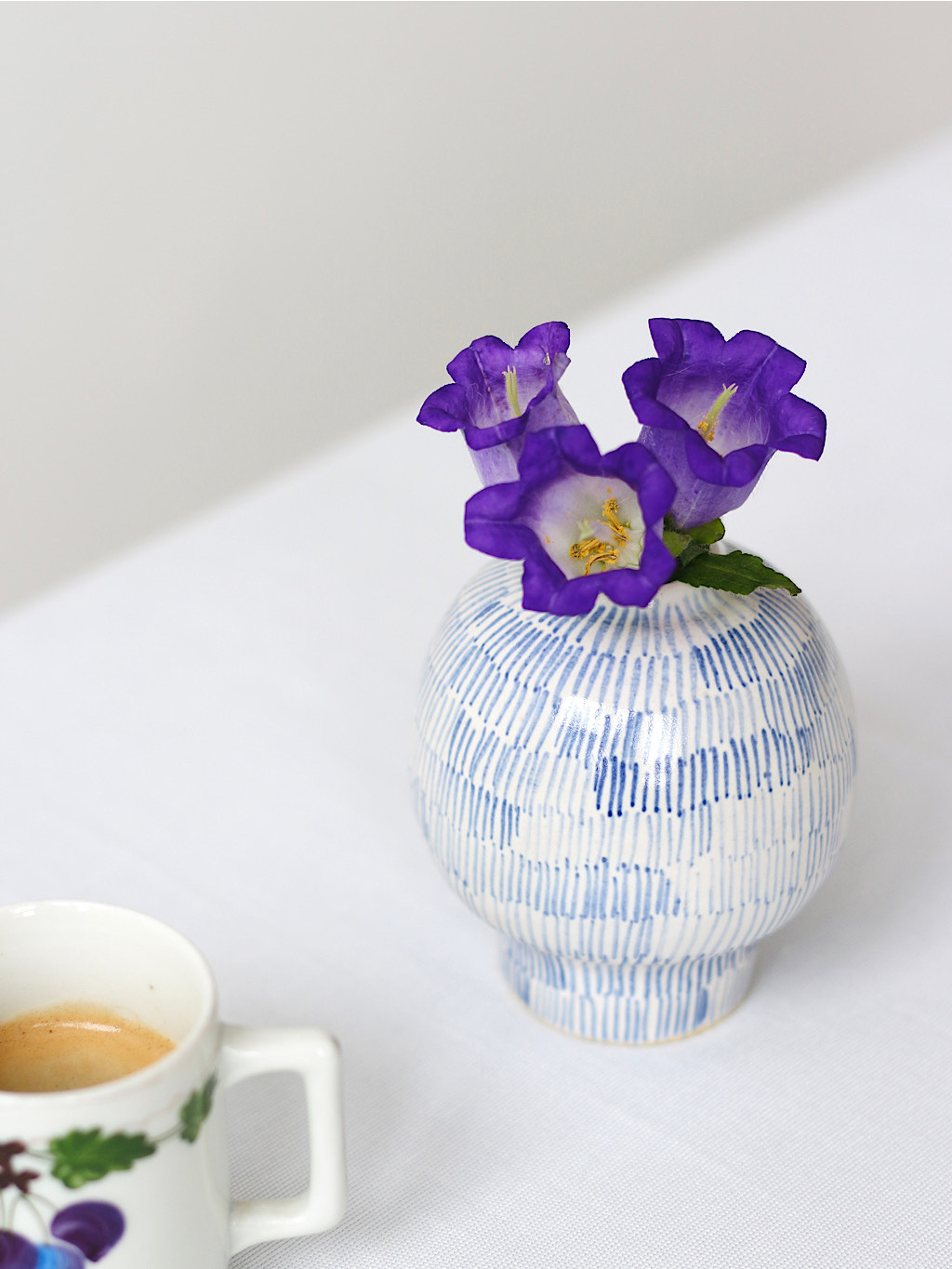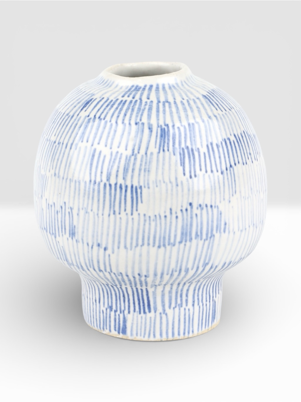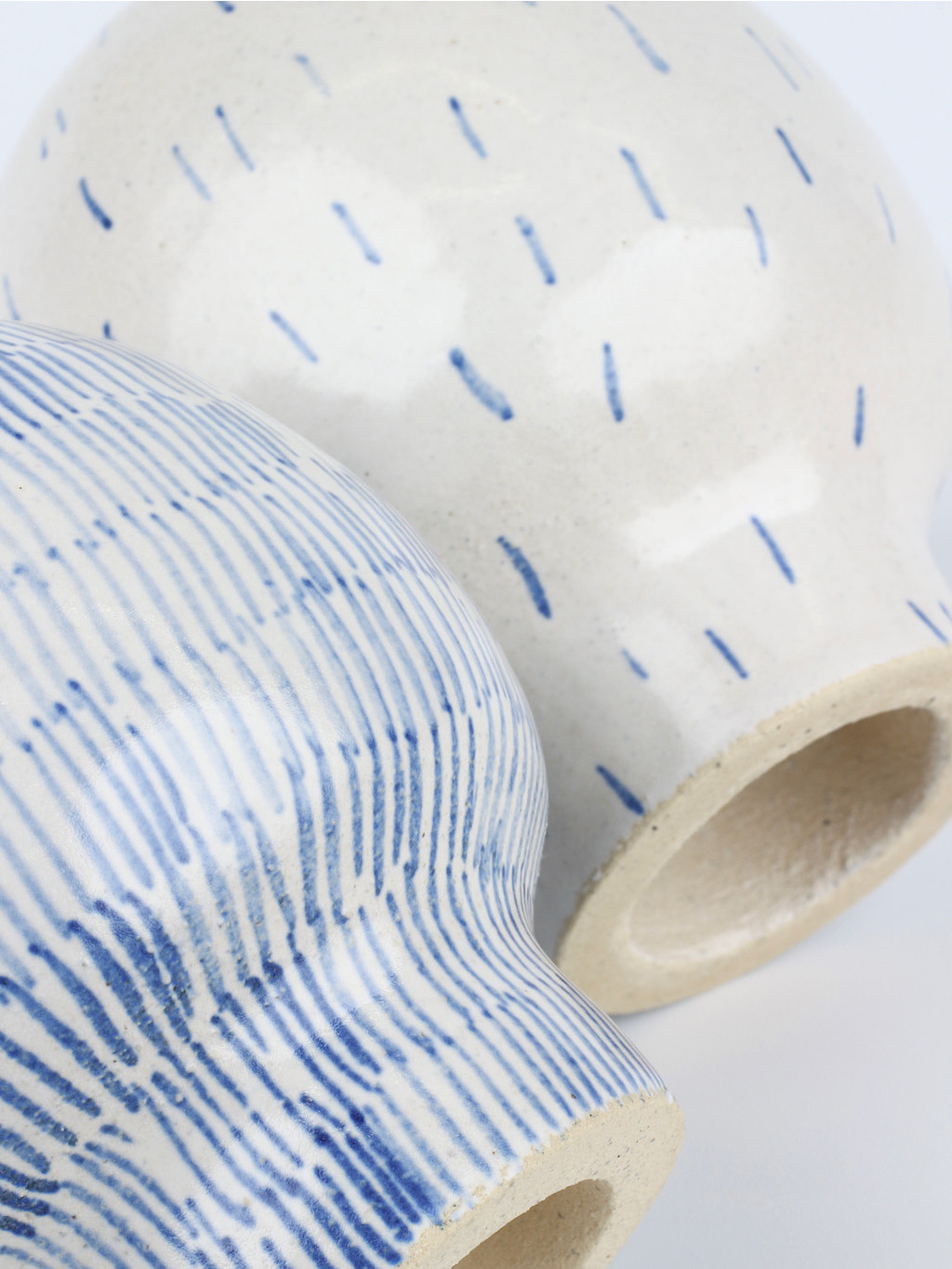 Vázy INK se hodí do komorních prostor i jako ozdoba pracovního stolu. Bílá glazura a modré linky evokují inkoustem psaný záznam nálady nebo tichého sdělení.