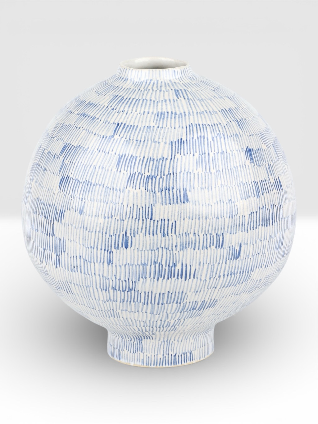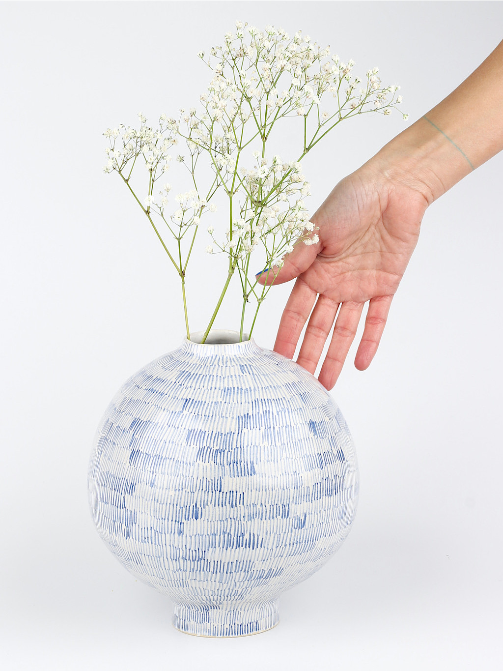 Rodinný recept, verše nebo milostný dopis… Ať už si představíte napsané inkoustem cokoli, vázy z kolekce INK v sobě nesou právě tento příběh. Každá váza je originál. Jemné modré linky připomínají rukou psaný text – někdy lehký a nenápadný, jindy výraznější, podle nálady a gesta.