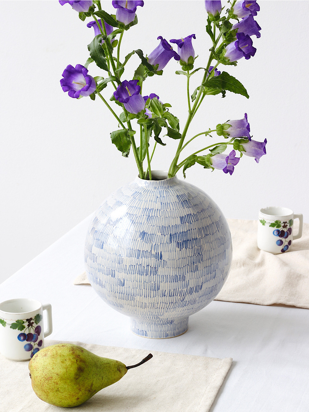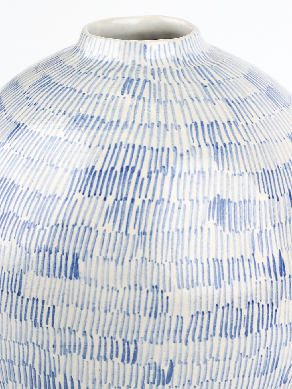 Vázy INK se hodí do komorních prostor i jako ozdoba pracovního stolu. Bílá glazura a modré linky evokují inkoustem psaný záznam nálady nebo tichého sdělení.