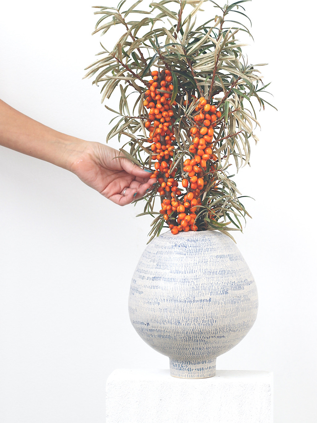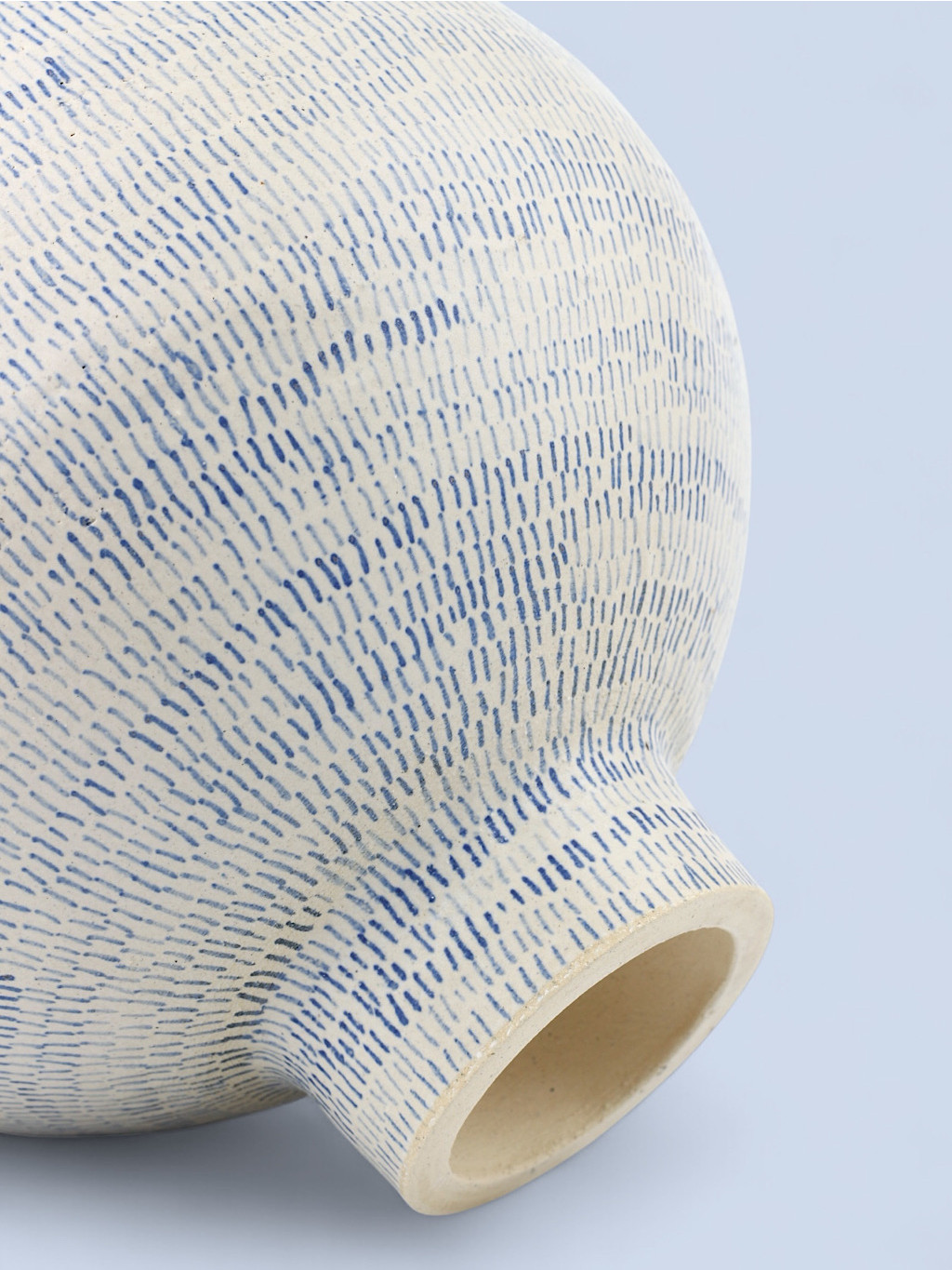 Rodinný recept, verše nebo milostný dopis… Ať už si představíte napsané inkoustem cokoli, vázy z kolekce INK v sobě nesou právě tento příběh. Každá váza je originál. Jemné modré linky připomínají rukou psaný text – někdy lehký a nenápadný, jindy výraznější, podle nálady a gesta.