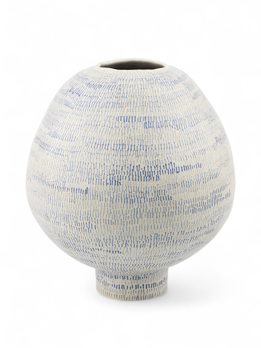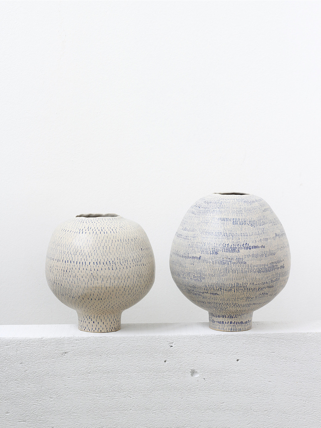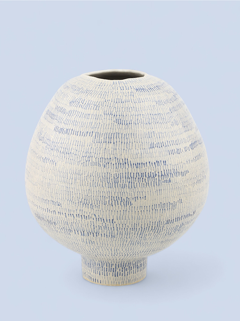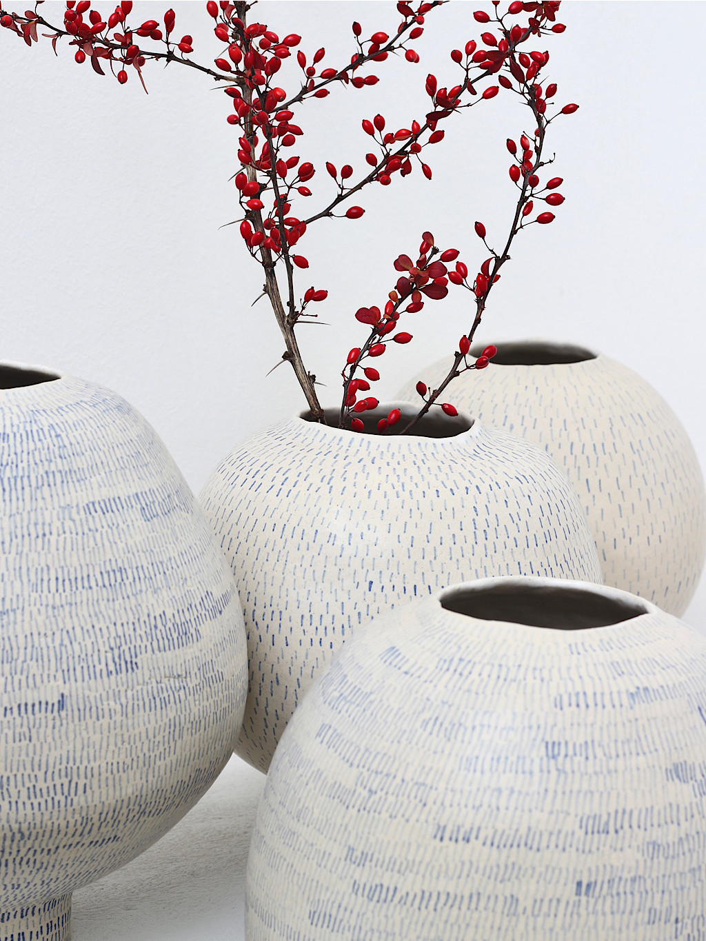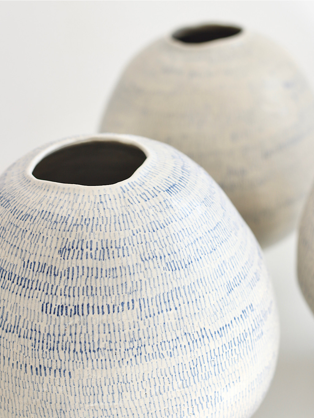 Vázy INK se hodí do komorních prostor i jako ozdoba pracovního stolu. Bílá glazura a modré linky evokují inkoustem psaný záznam nálady nebo tichého sdělení.