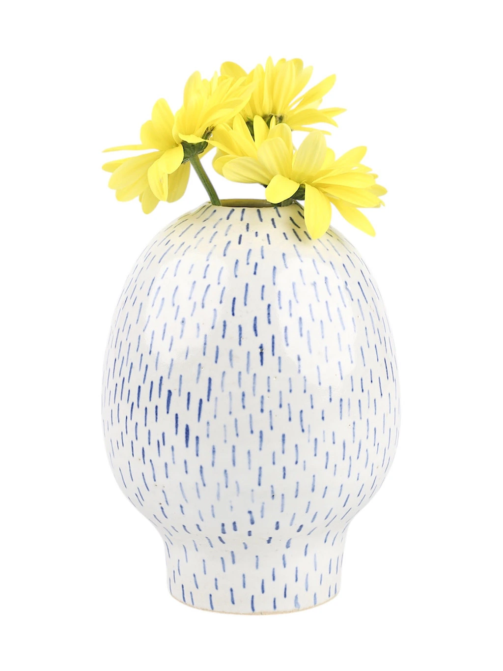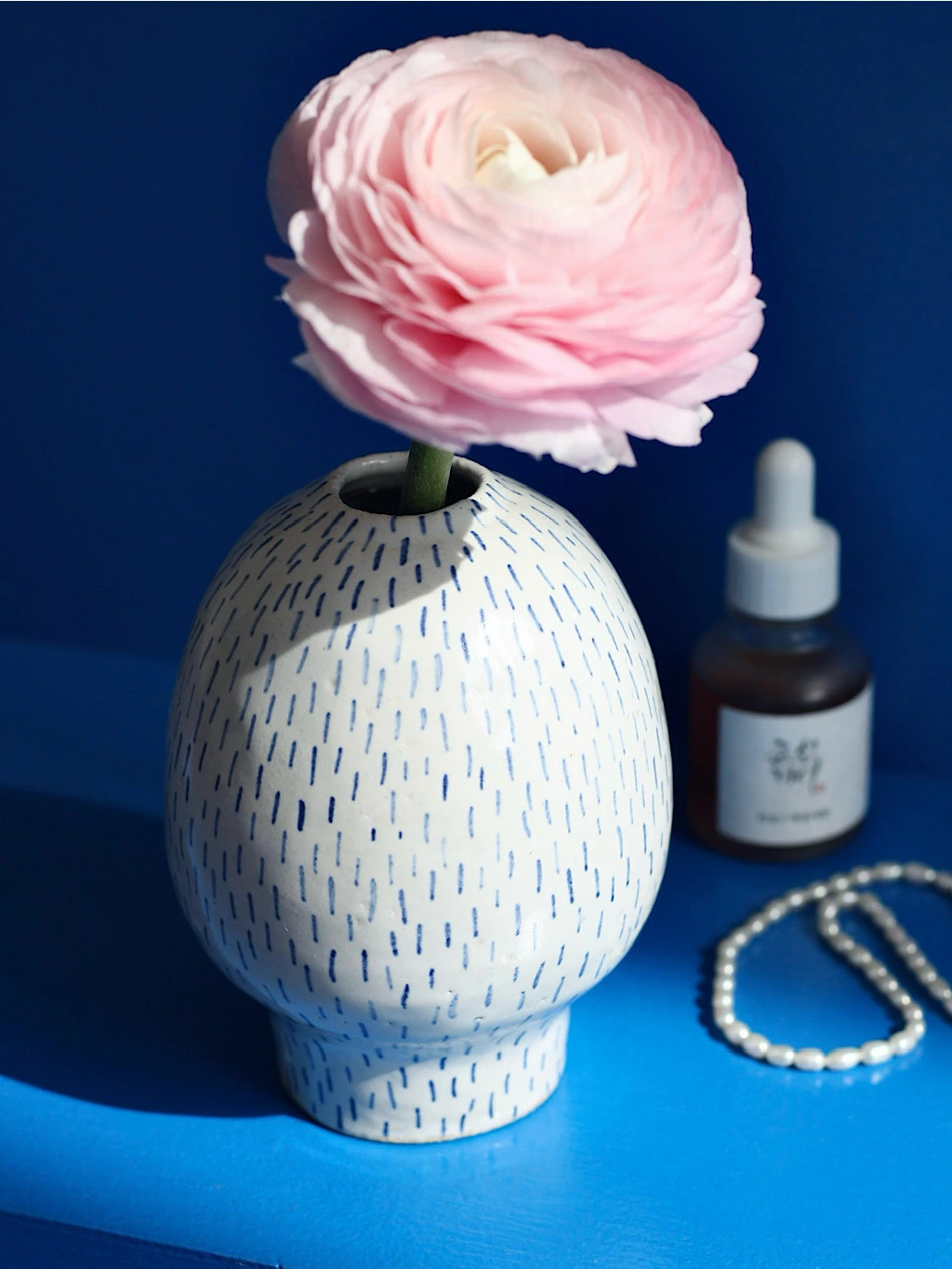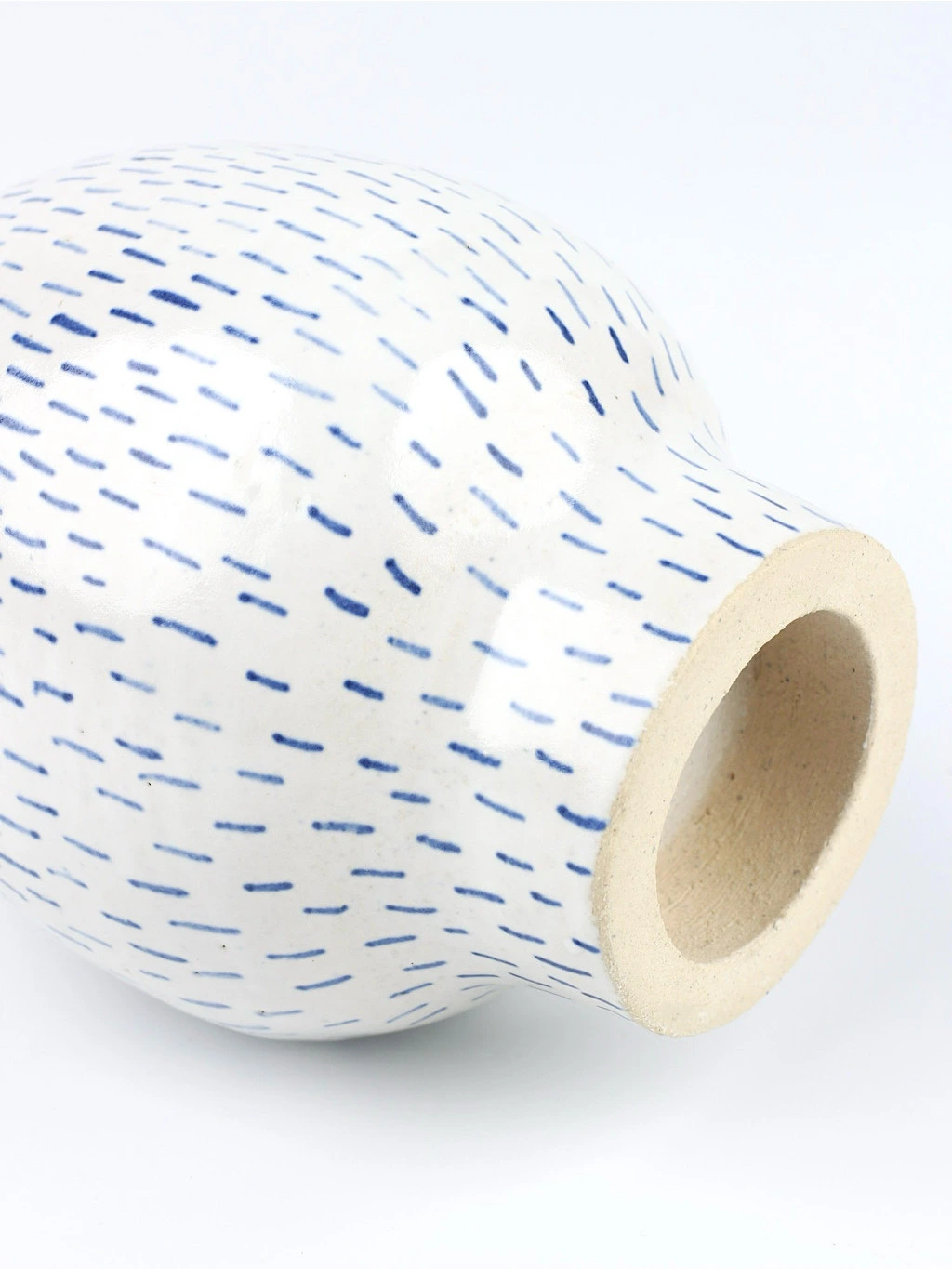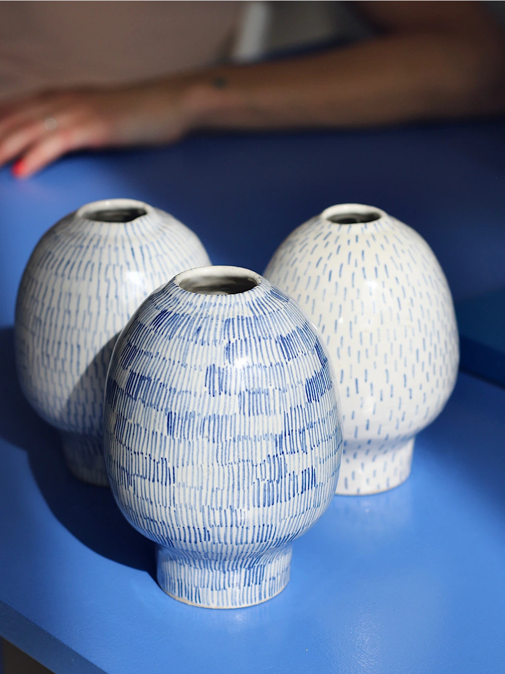 Vázy INK se hodí do komorních prostor i jako ozdoba pracovního stolu. Bílá glazura a modré linky evokují inkoustem psaný záznam nálady nebo tichého sdělení.