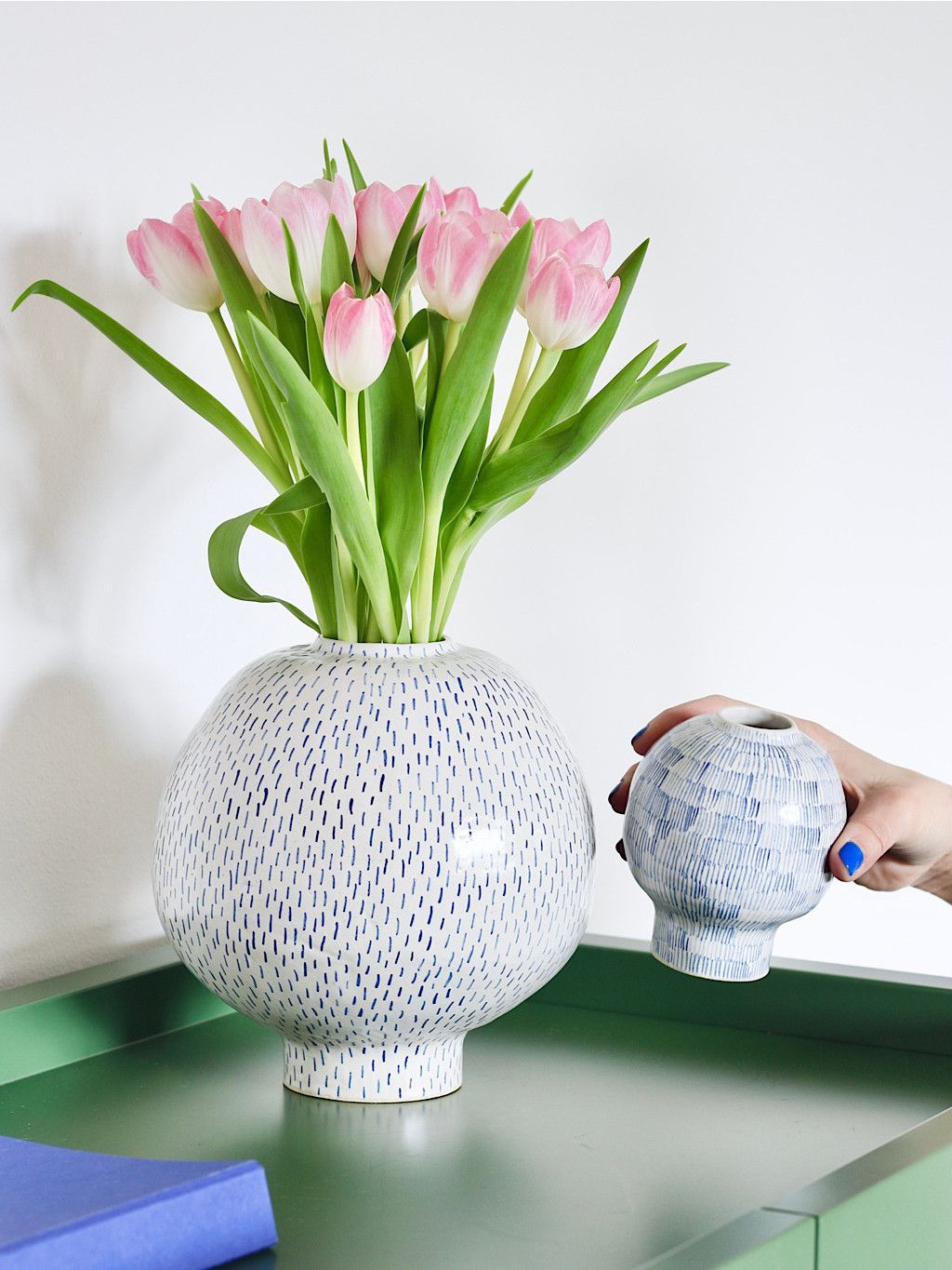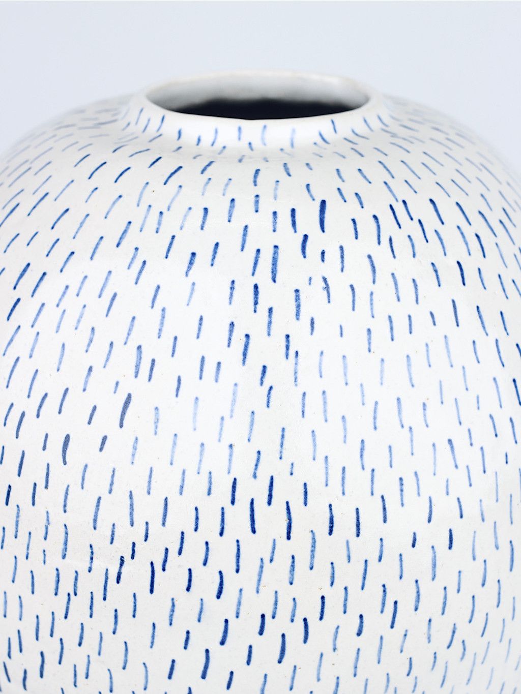 Vázy INK se hodí do komorních prostor i jako ozdoba pracovního stolu. Bílá glazura a modré linky evokují inkoustem psaný záznam nálady nebo tichého sdělení.