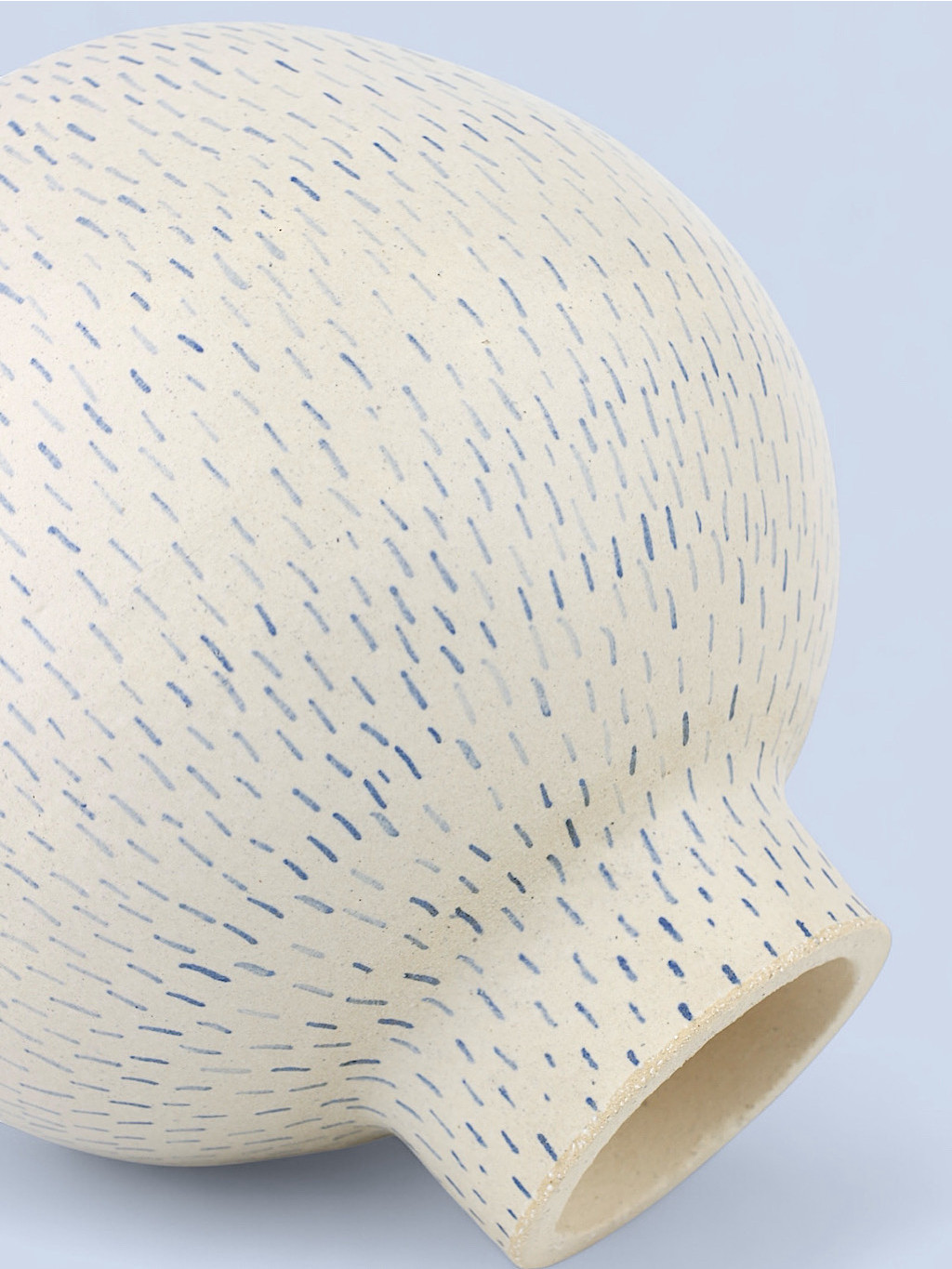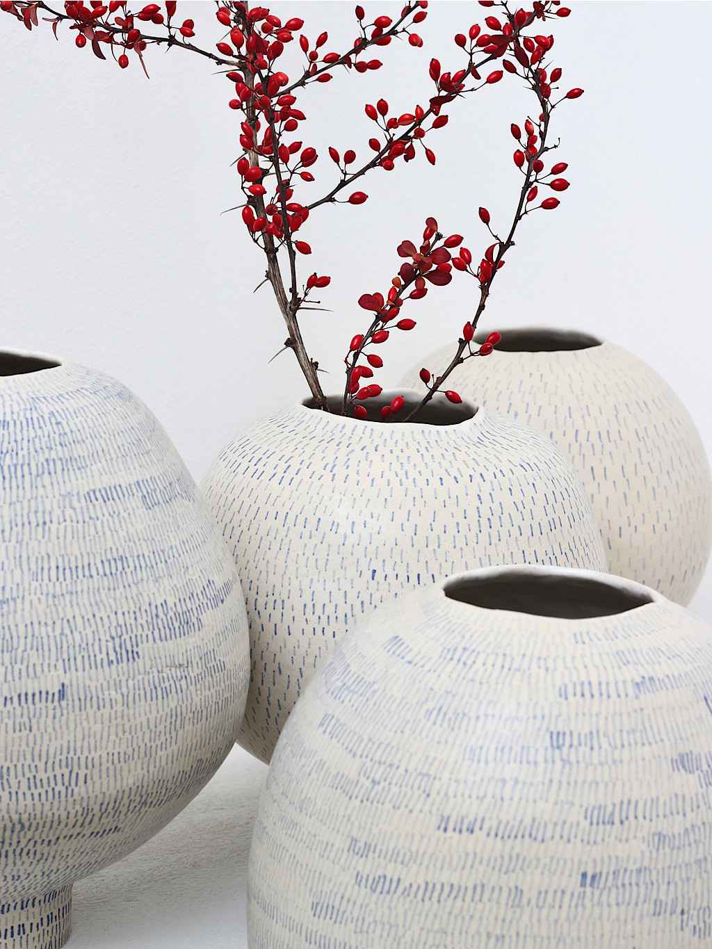 Vázy INK se hodí do komorních prostor i jako ozdoba pracovního stolu. Bílá glazura a modré linky evokují inkoustem psaný záznam nálady nebo tichého sdělení.