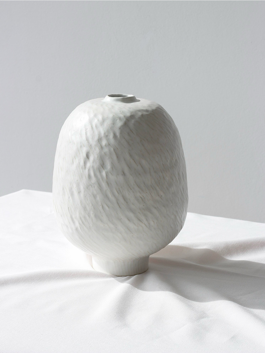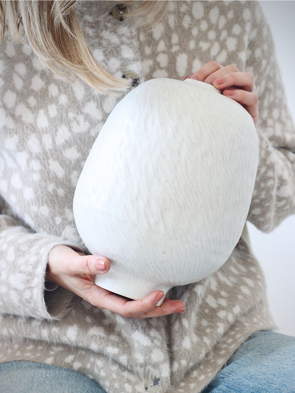 Vázy z kolekce LUMA vznikly z jednoduché myšlenky: někdy interiér nepotřebuje další barvu. Stačí světlo. Každá váza je originál. Jemně zvlněný povrch zachycuje světlo a během dne vytváří drobné proměnlivé stíny, které dávají každému kusu klidný a přirozený výraz.