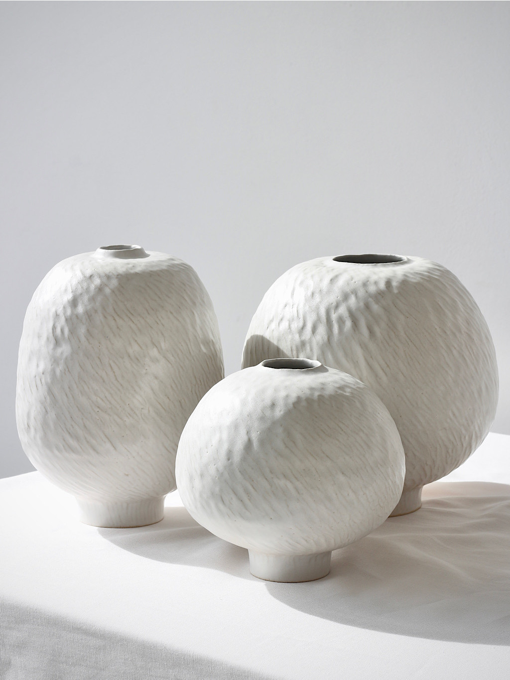 Kolekce LUMA je oslavou světla v interiéru. Bílé keramické vázy s jemně zvlněným povrchem ho zachycují a během dne vytvářejí drobné proměnlivé stíny. Každý kus je ručně modelovaný, a proto je jedinečný.