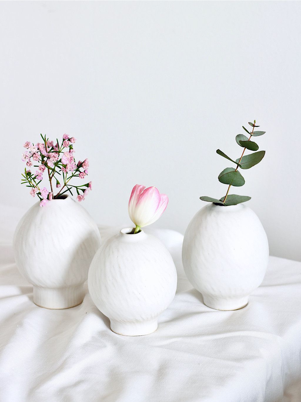 Díky čisté bílé barvě a sošnému tvaru působí jako malý objekt, který prostor neruší, ale přirozeně ho doplňuje. Nejkrásněji vynikne samostatně nebo s jednoduchou květinou či větvičkou.