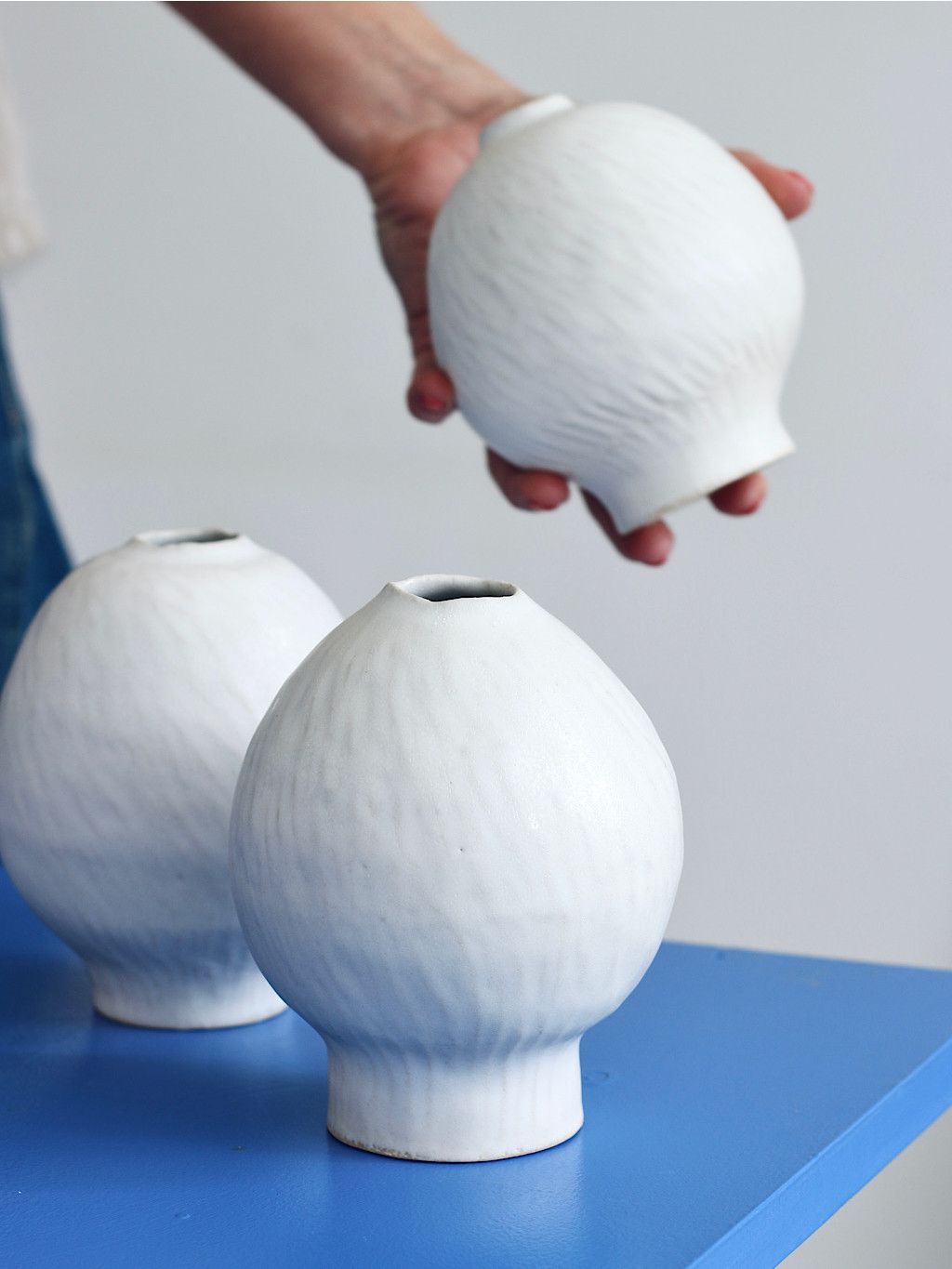 Kolekce LUMA je oslavou světla v interiéru. Bílé keramické vázy s jemně zvlněným povrchem ho zachycují a během dne vytvářejí drobné proměnlivé stíny. Každý kus je ručně modelovaný, a proto je jedinečný.