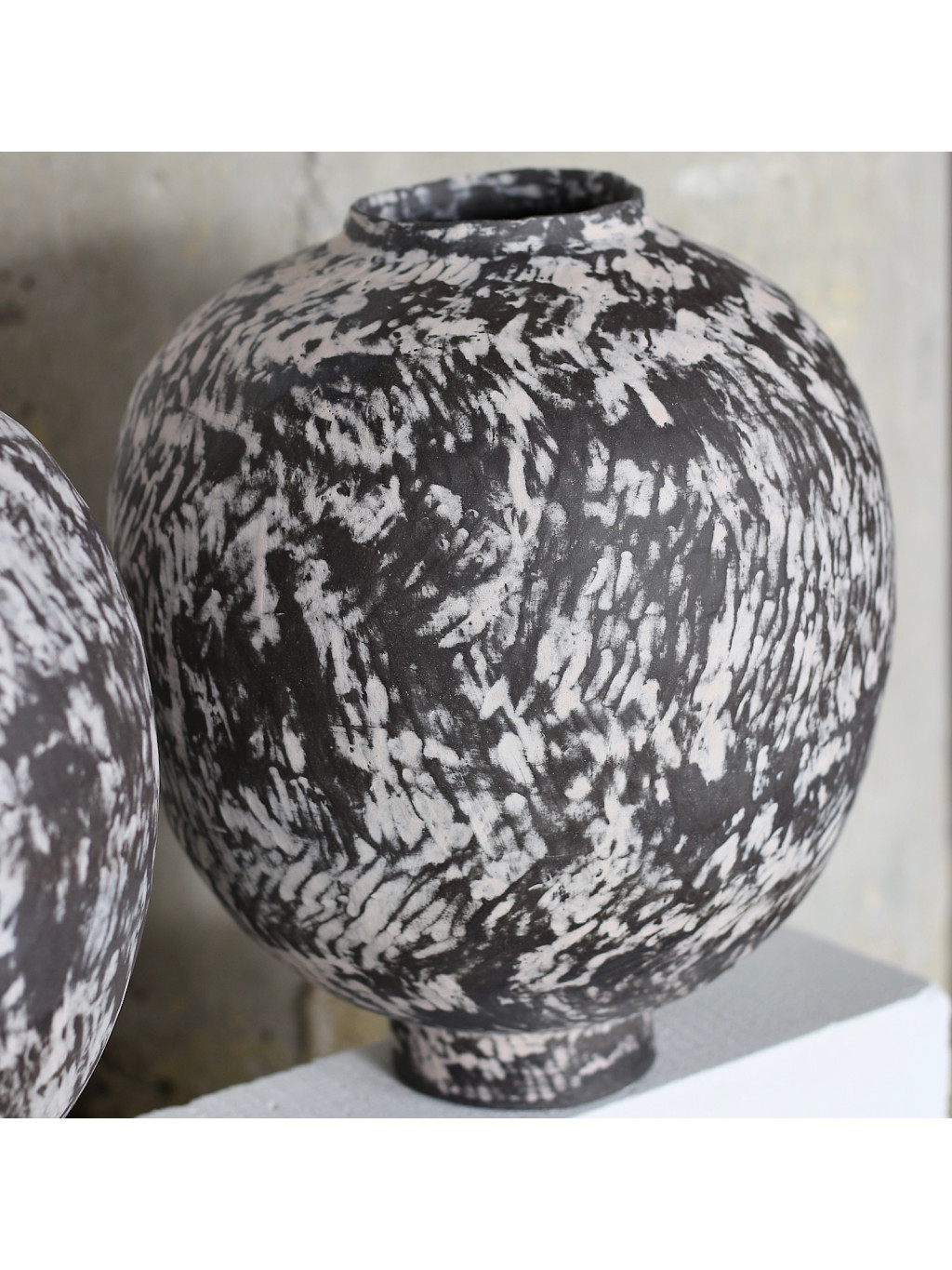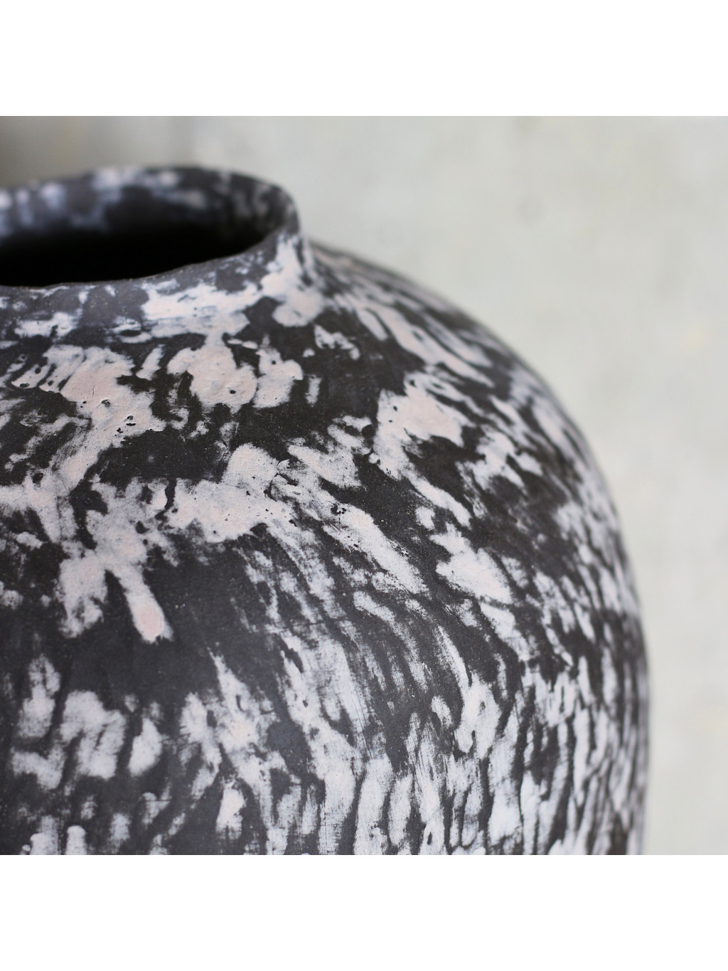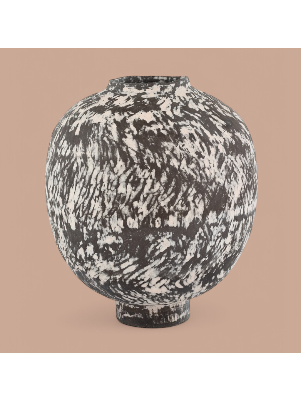 Modelovaná z tmavé hlíny technikou handbuilt a dvakrát vypálená při vysokých teplotách, váza získává výjimečnou pevnost a estetickou hloubku. Uvnitř ji pokrývá glazura, která nejen chrání, ale zároveň dodává jemný kontrast k přírodnímu povrchu zvenčí. Bez obav ji naplníte vodou i čerstvými květinami.