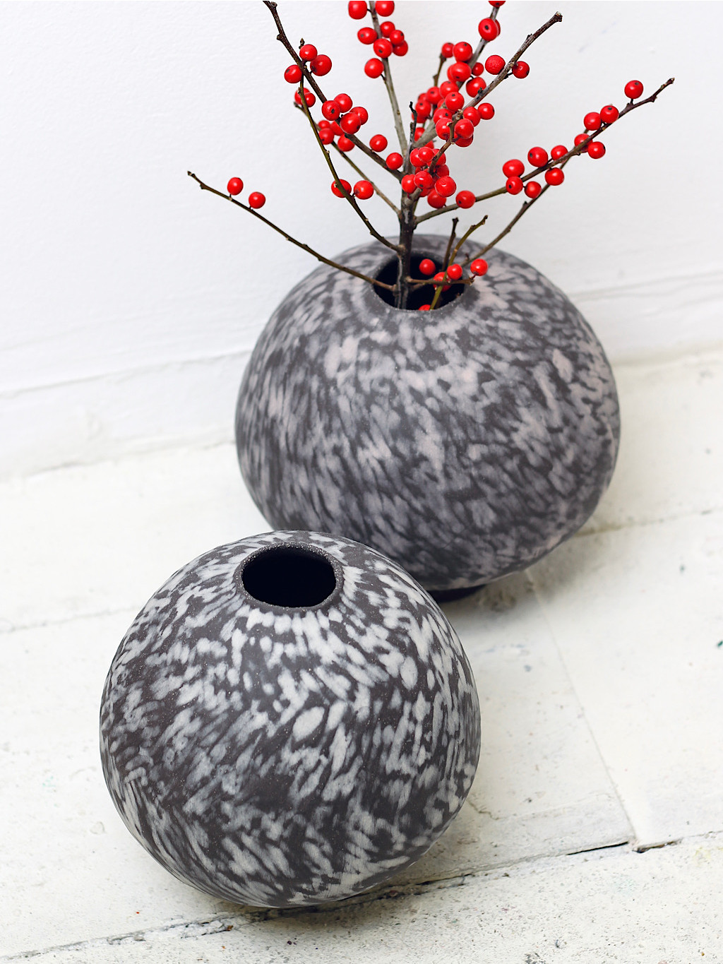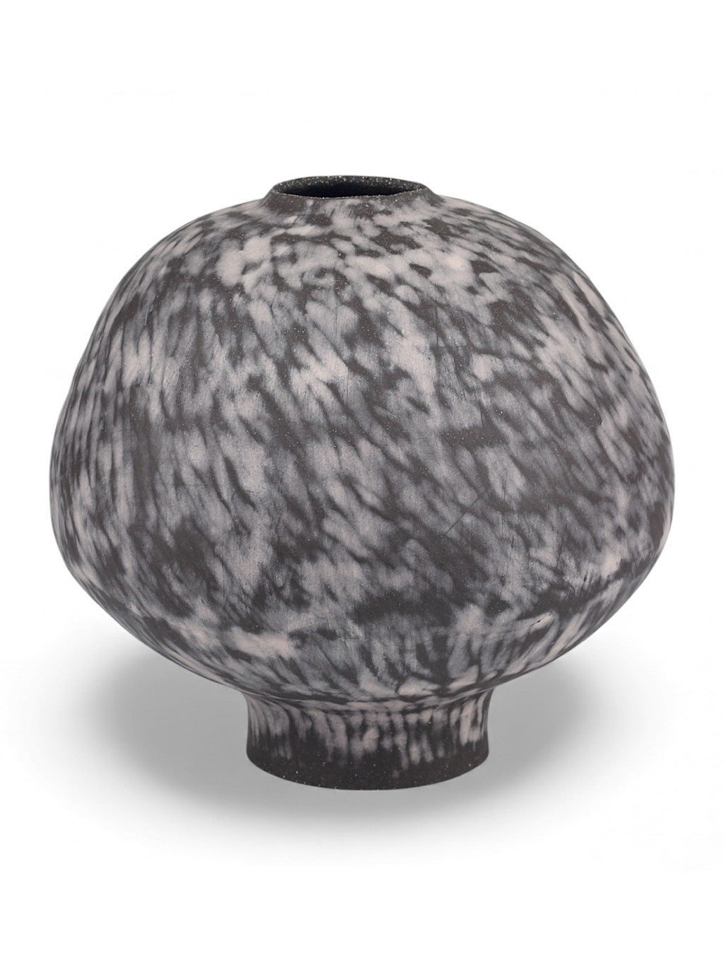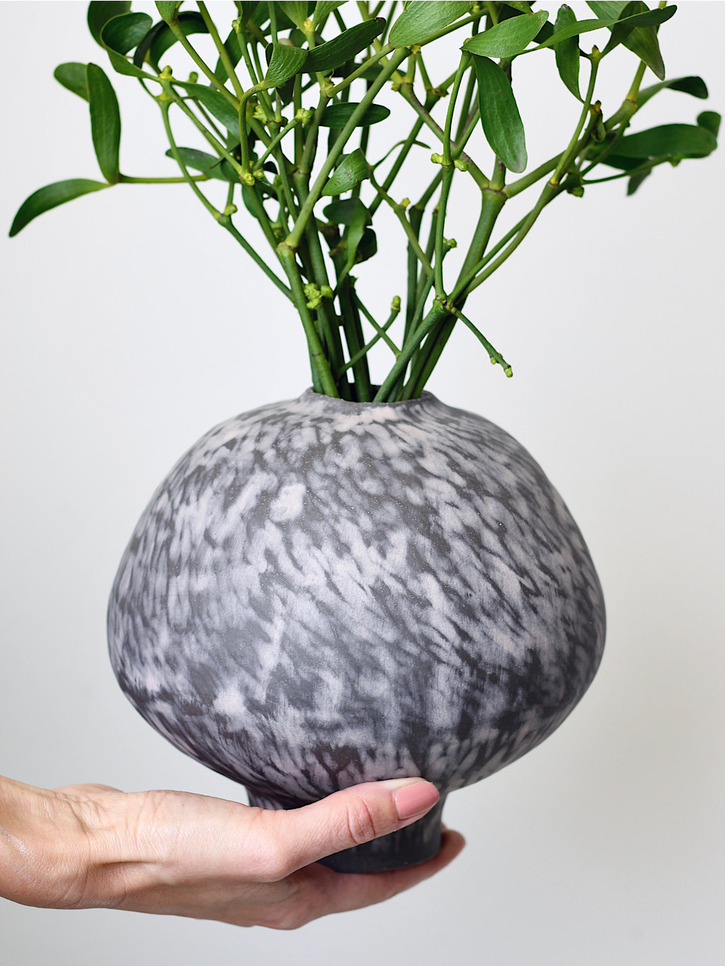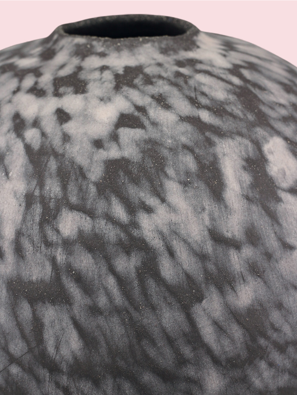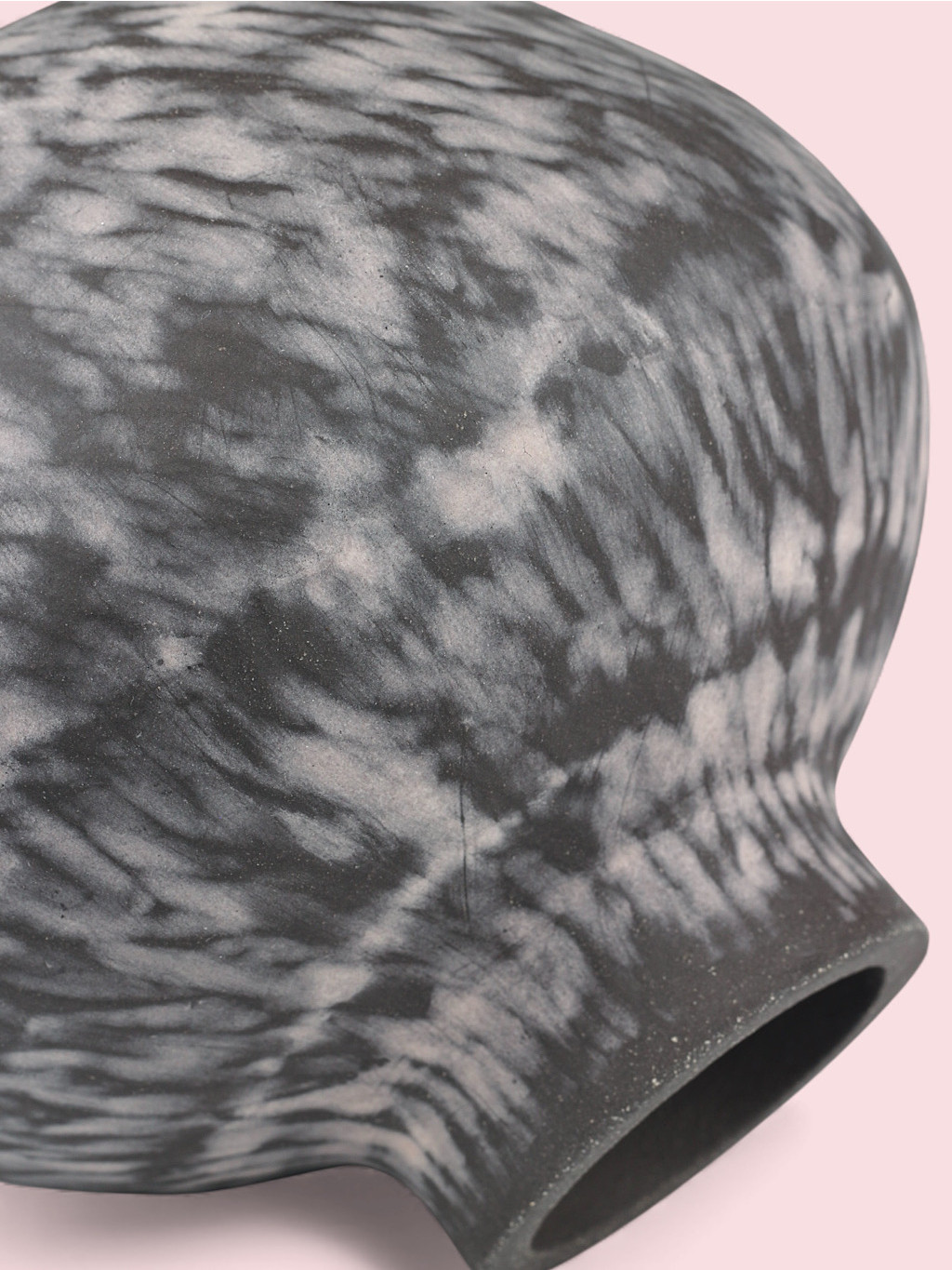 Modelovaná z tmavé hlíny technikou handbuilt a dvakrát vypálená při vysokých teplotách, váza získává výjimečnou pevnost a estetickou hloubku. Uvnitř ji pokrývá glazura, která nejen chrání, ale zároveň dodává jemný kontrast k přírodnímu povrchu zvenčí. Bez obav ji naplníte vodou i čerstvými květinami.