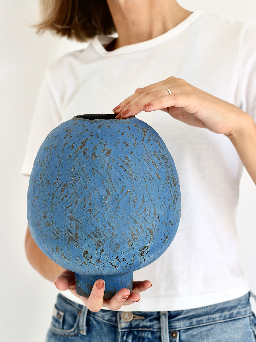 Modelovaná z tmavé hlíny technikou handbuilt a dvakrát vypálená při vysokých teplotách, váza získává výjimečnou pevnost a estetickou hloubku. Uvnitř ji pokrývá glazura, která nejen chrání, ale zároveň dodává jemný kontrast k přírodnímu povrchu zvenčí. Bez obav ji naplníte vodou i čerstvými květinami.