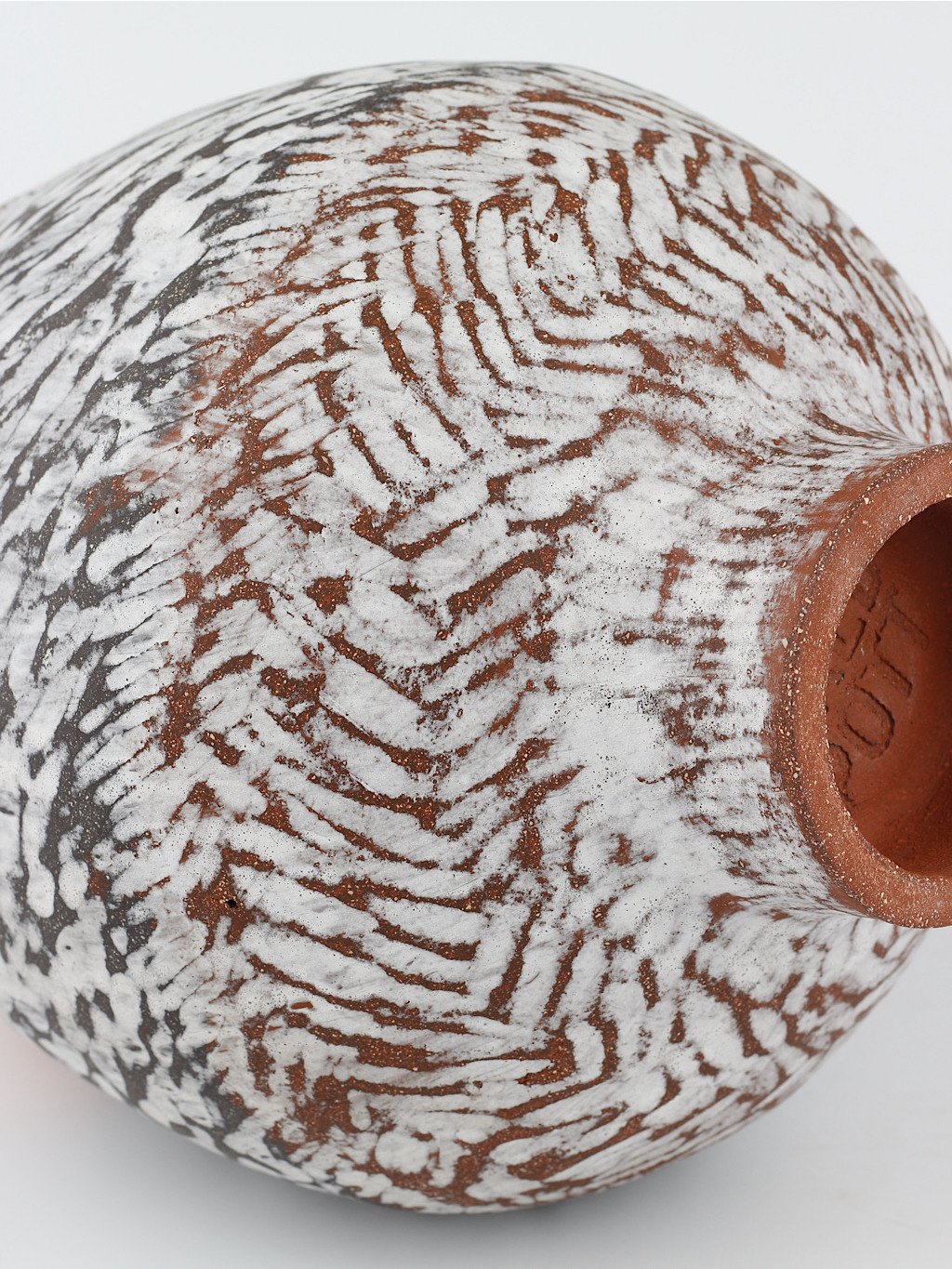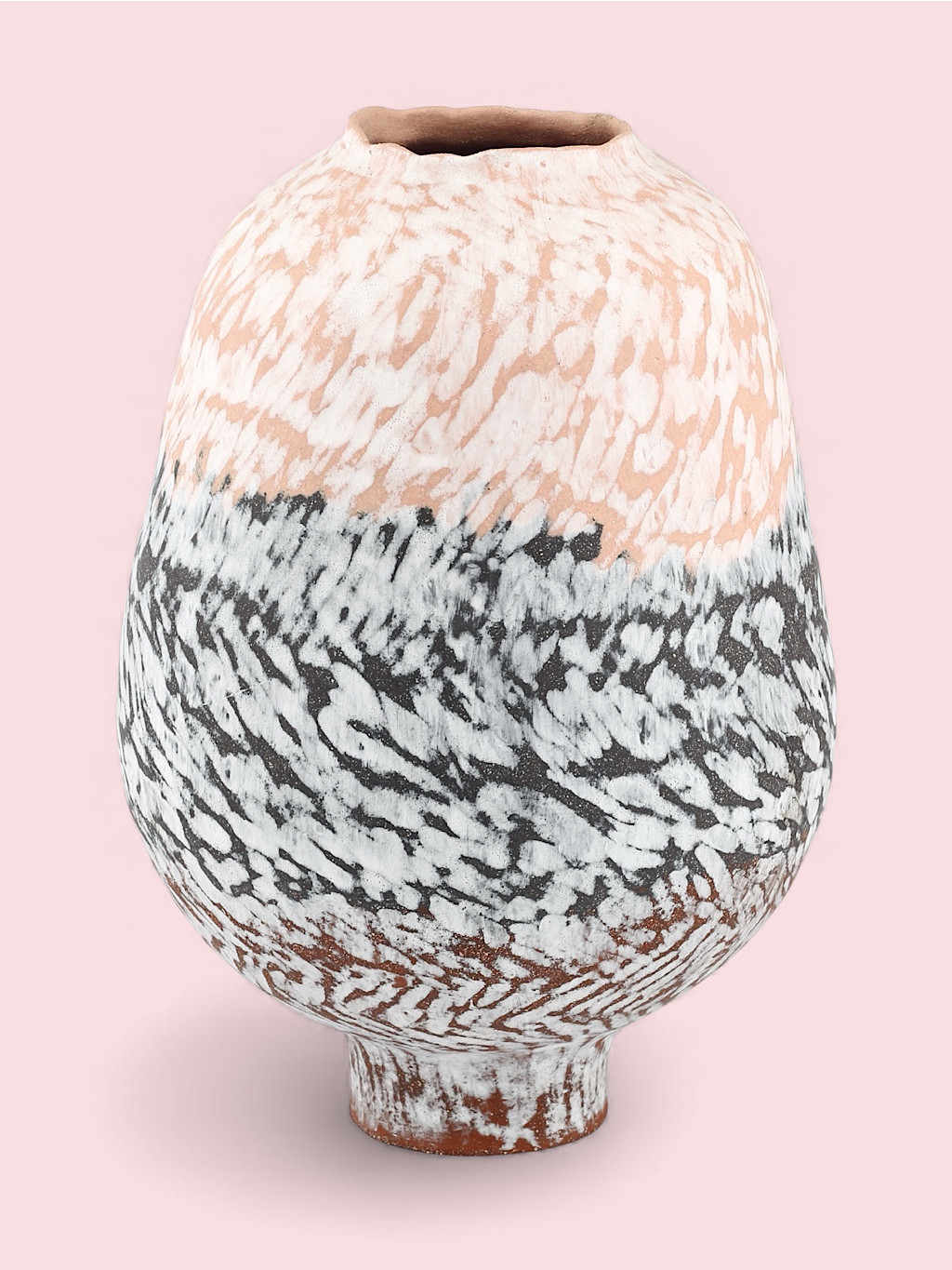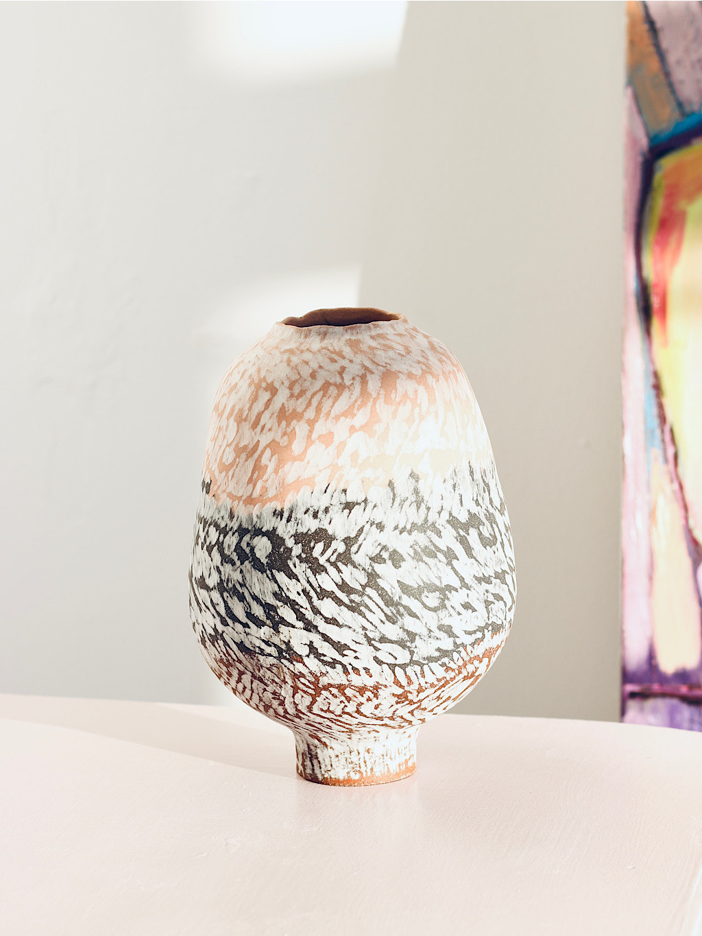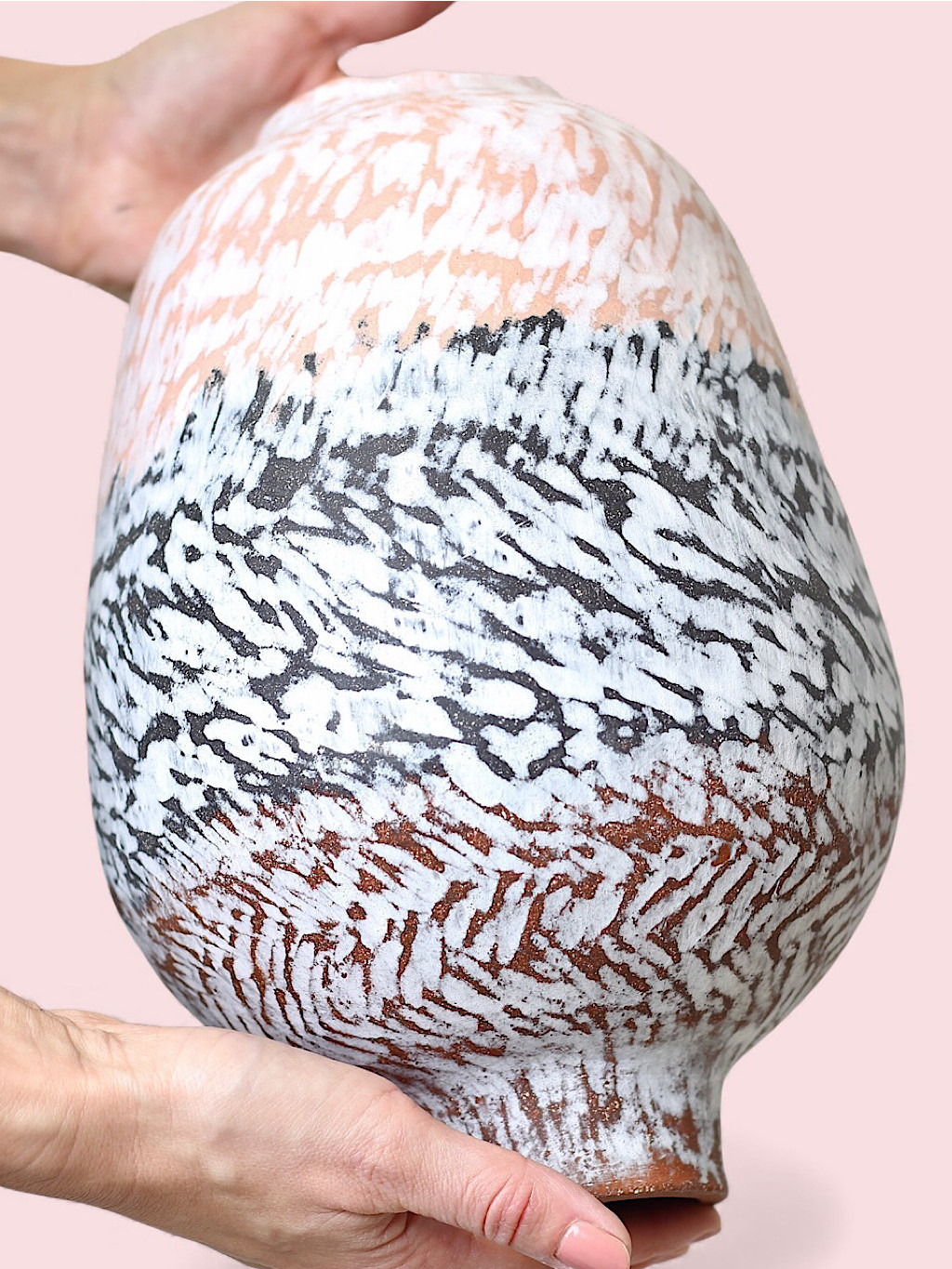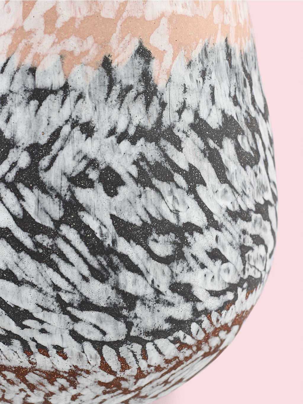 Modelovaná ze tří různých druhů hlíny technikou handbuilt a dvakrát vypálená při vysokých teplotách, váza získává výjimečnou pevnost a estetickou hloubku. Uvnitř ji pokrývá glazura, která nejen chrání, ale zároveň dodává jemný kontrast k přírodnímu povrchu zvenčí. Bez obav ji naplníte vodou i čerstvými květinami.