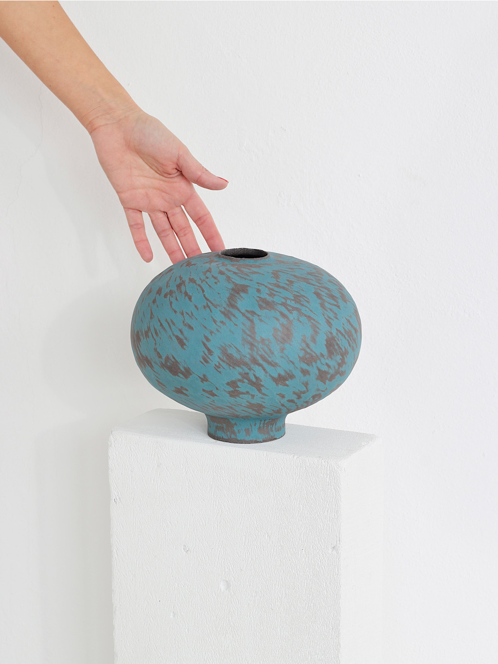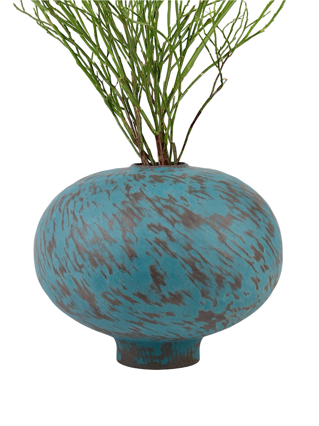 Modelovaná z tmavé hlíny technikou handbuilt a dvakrát vypálená při vysokých teplotách, váza získává výjimečnou pevnost a estetickou hloubku. Uvnitř ji pokrývá glazura, která nejen chrání, ale zároveň dodává jemný kontrast k přírodnímu povrchu zvenčí. Bez obav ji naplníte vodou i čerstvými květinami.