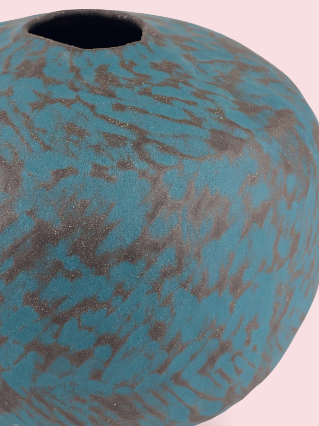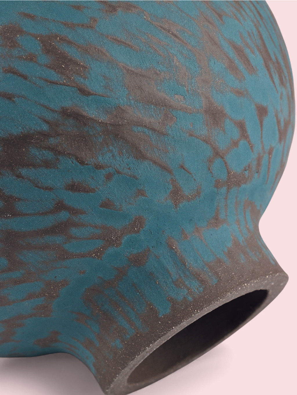 Modelovaná z tmavé hlíny technikou handbuilt a dvakrát vypálená při vysokých teplotách, váza získává výjimečnou pevnost a estetickou hloubku. Uvnitř ji pokrývá glazura, která nejen chrání, ale zároveň dodává jemný kontrast k přírodnímu povrchu zvenčí. Bez obav ji naplníte vodou i čerstvými květinami.