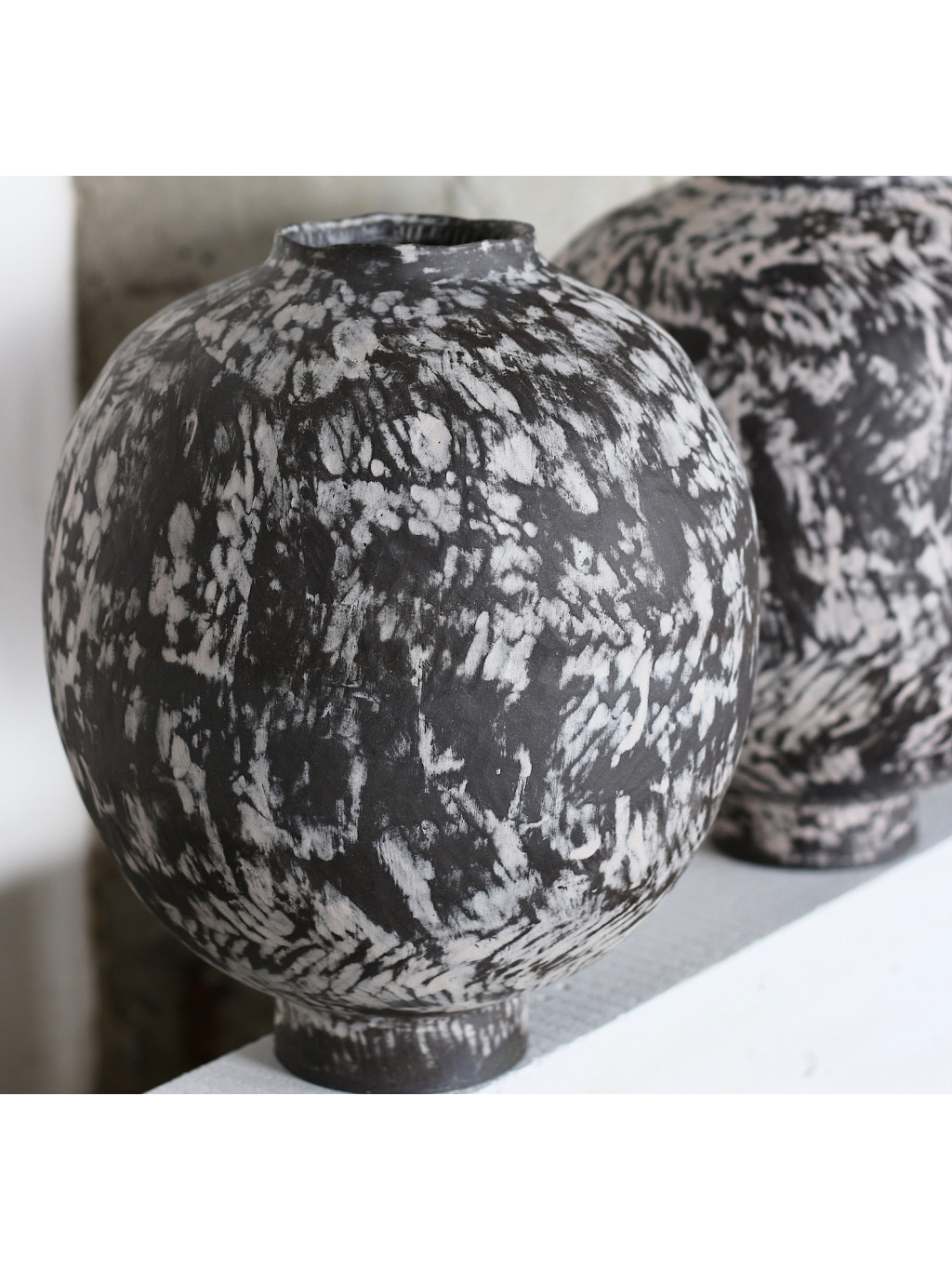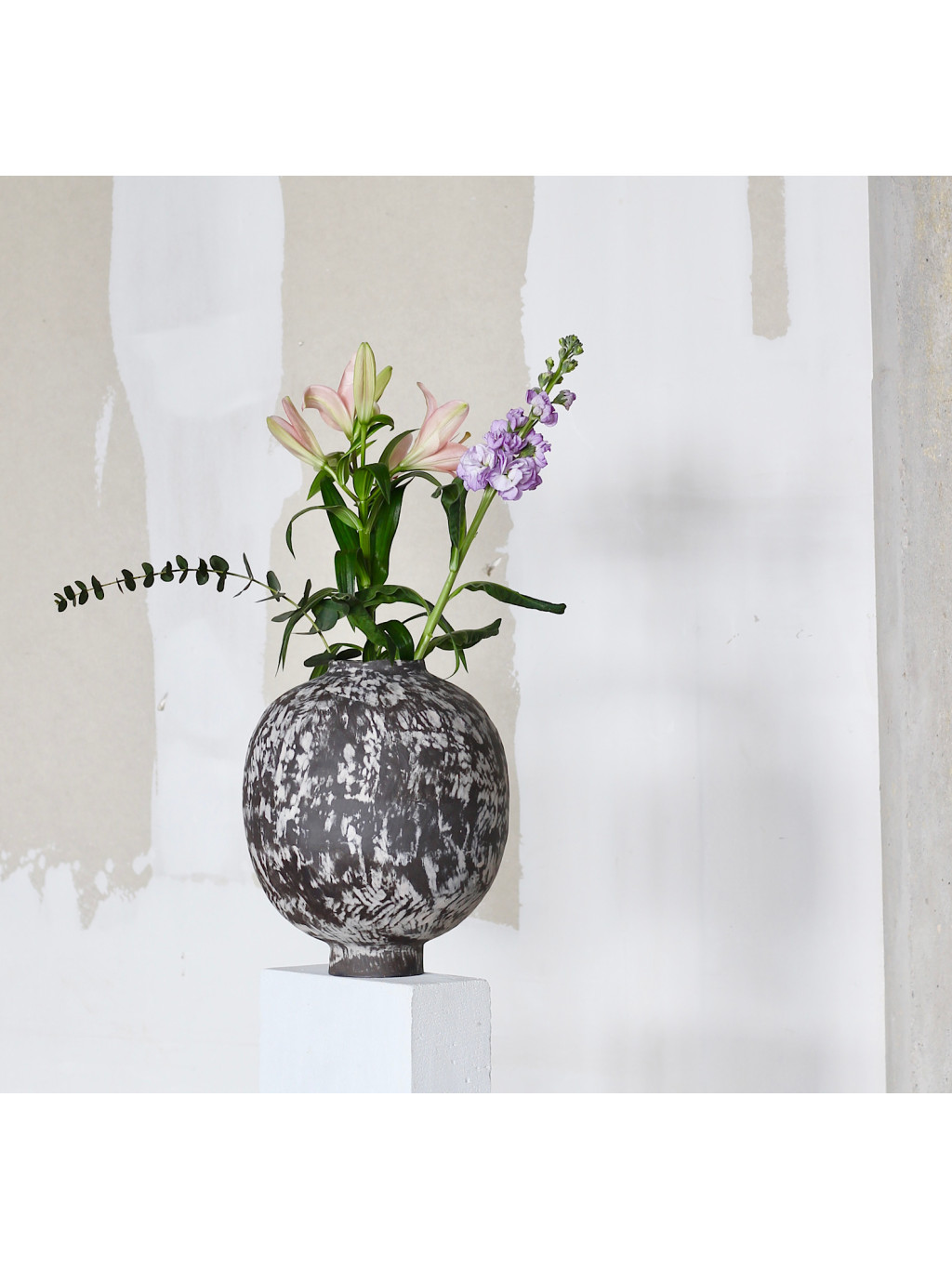 Modelovaná z tmavé hlíny technikou handbuilt a dvakrát vypálená při vysokých teplotách, váza získává výjimečnou pevnost a estetickou hloubku. Uvnitř ji pokrývá glazura, která nejen chrání, ale zároveň dodává jemný kontrast k přírodnímu povrchu zvenčí. Bez obav ji naplníte vodou i čerstvými květinami.